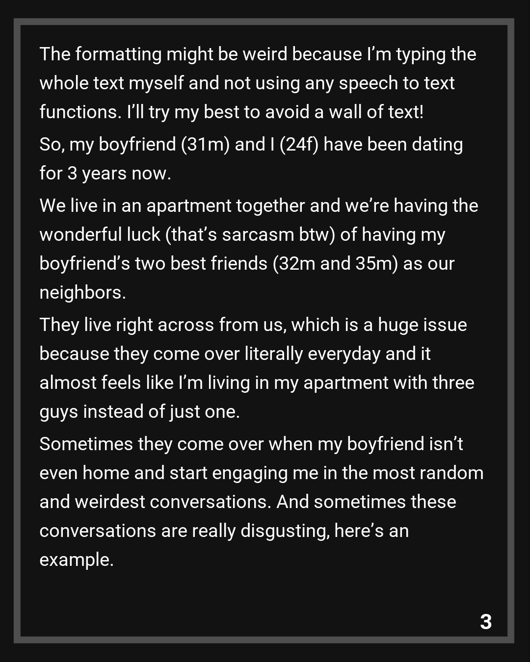 So, my boyfriend (31m) and I (24f) have been dating for 3 years now. We live in an apartment together and we’re having the wonderful luck (that’s sarcasm btw) of having my boyfriend’s two best friends (32m and 35m) as our neighbors. They live right across from us, which is a huge issue because they come over literally everyday and it almost feels like I’m living in my apartment with three guys instead of just one. Sometimes they come over when my boyfriend isn’t even home and start engaging me in the most random and weirdest conversations. And sometimes these conversations are really disgusting, here’s an example.
