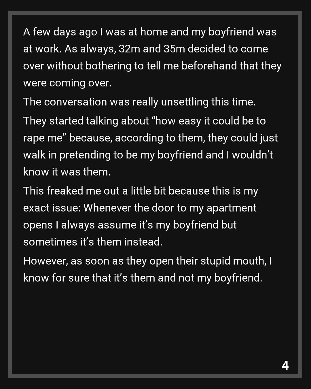 A few days ago I was at home and my boyfriend was at work. As always, 32m and 35m decided to come over without bothering to tell me beforehand that they were coming over. The conversation was really unsettling this time. They started talking about “how easy it could be to rape me” because, according to them, they could just walk in pretending to be my boyfriend and I wouldn’t know it was them. This freaked me out a little bit because this is my exact issue: Whenever the door to my apartment opens I always assume it’s my boyfriend but sometimes it’s them instead. However, as soon as they open their stupid mouth, I know for sure that it’s them and not my boyfriend.