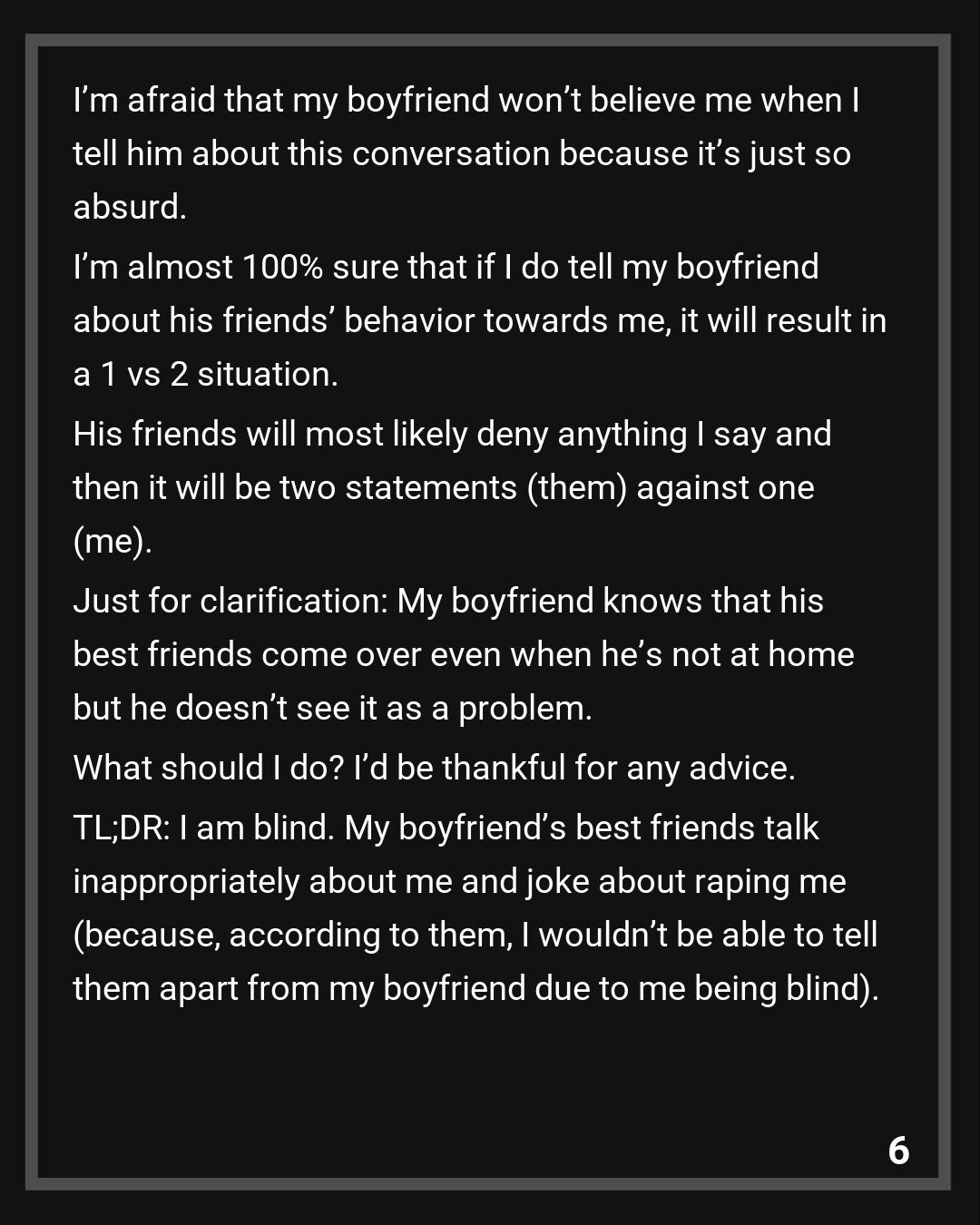 TL;DR: I am blind. My boyfriend’s best friends talk inappropriately about me and joke about raping me (because, according to them, I wouldn’t be able to tell them apart from my boyfriend due to me being blind). My boyfriend doesn’t know that they’re talking about me like this.