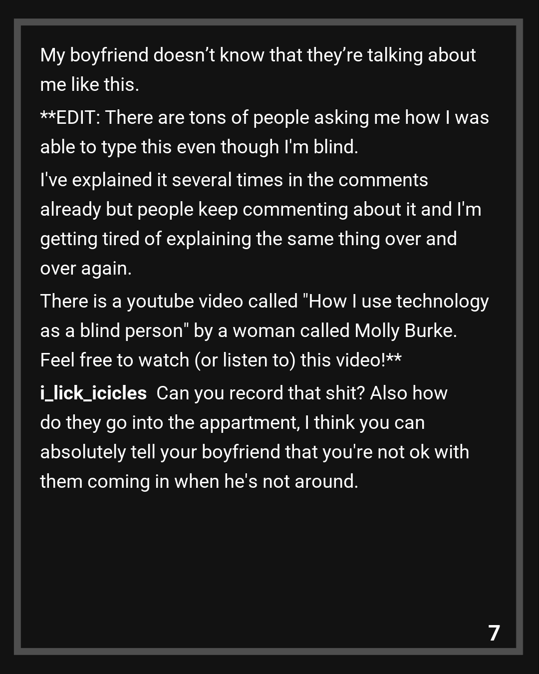 I’m used to people not knowing how to act in front of me because of my blindness, but my boyfriend’s friends conversations aren’t just uncomfortable or awkward, they’re terrifying. I don’t think they would ever touch me against my will but conversations like this are incredibly unsettling and I wish they would stop talking about me like that. I haven’t told my boyfriend about this exact situation but I told him that his friends make me uncomfortable. I’m afraid that my boyfriend won’t believe me when I tell him about this conversation because it’s just so absurd.