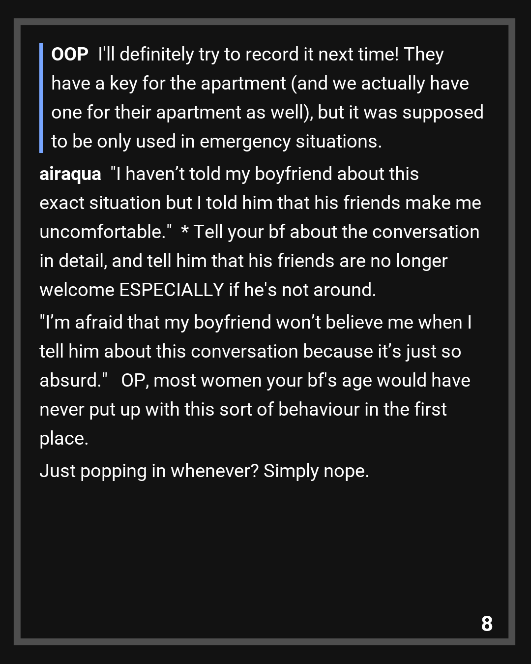 Just for clarification: My boyfriend knows that his best friends come over even when he’s not at home but he doesn’t see it as a problem.