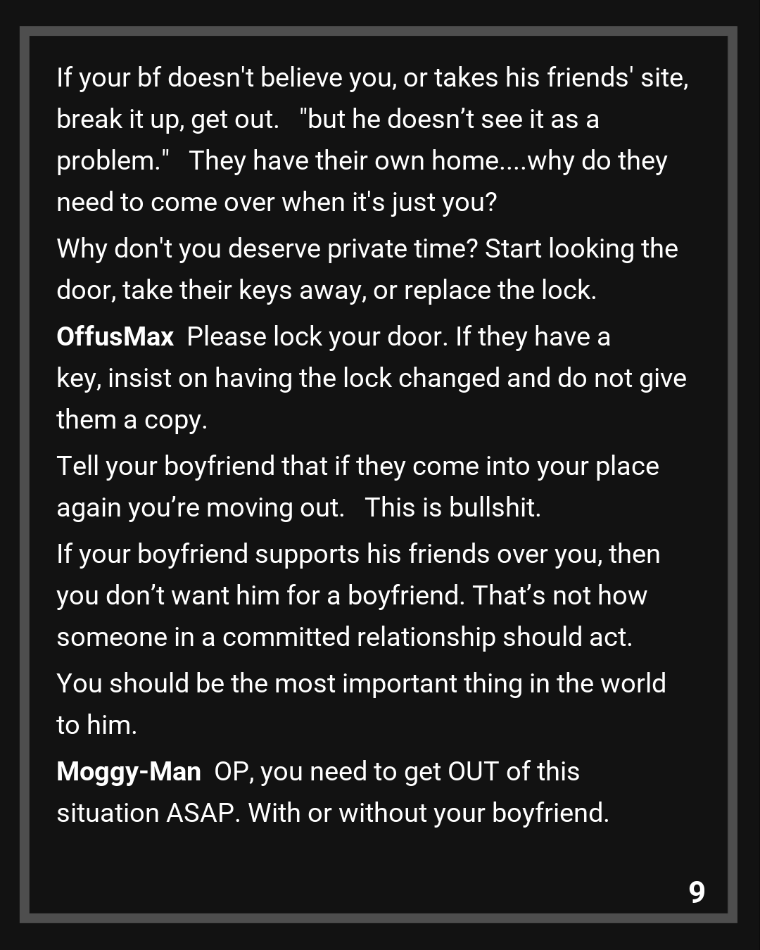 When my boyfriend came home I was finally able to tell him about everything. I’ve never witnessed him being so angry. He genuinely thought that his friends were helping me out when he was at work and he apologized for not taking me seriously when I told him that his friends make me uncomfortable.