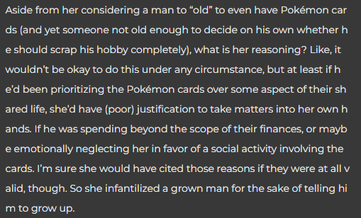 Commenter 3: Not even exaggerating, this is divorce-worthy. And she’ll probably paint it as you divorcing her over silly Pokemon cards, but it’s you divorcing her because she doesn’t respect you or the things you love.