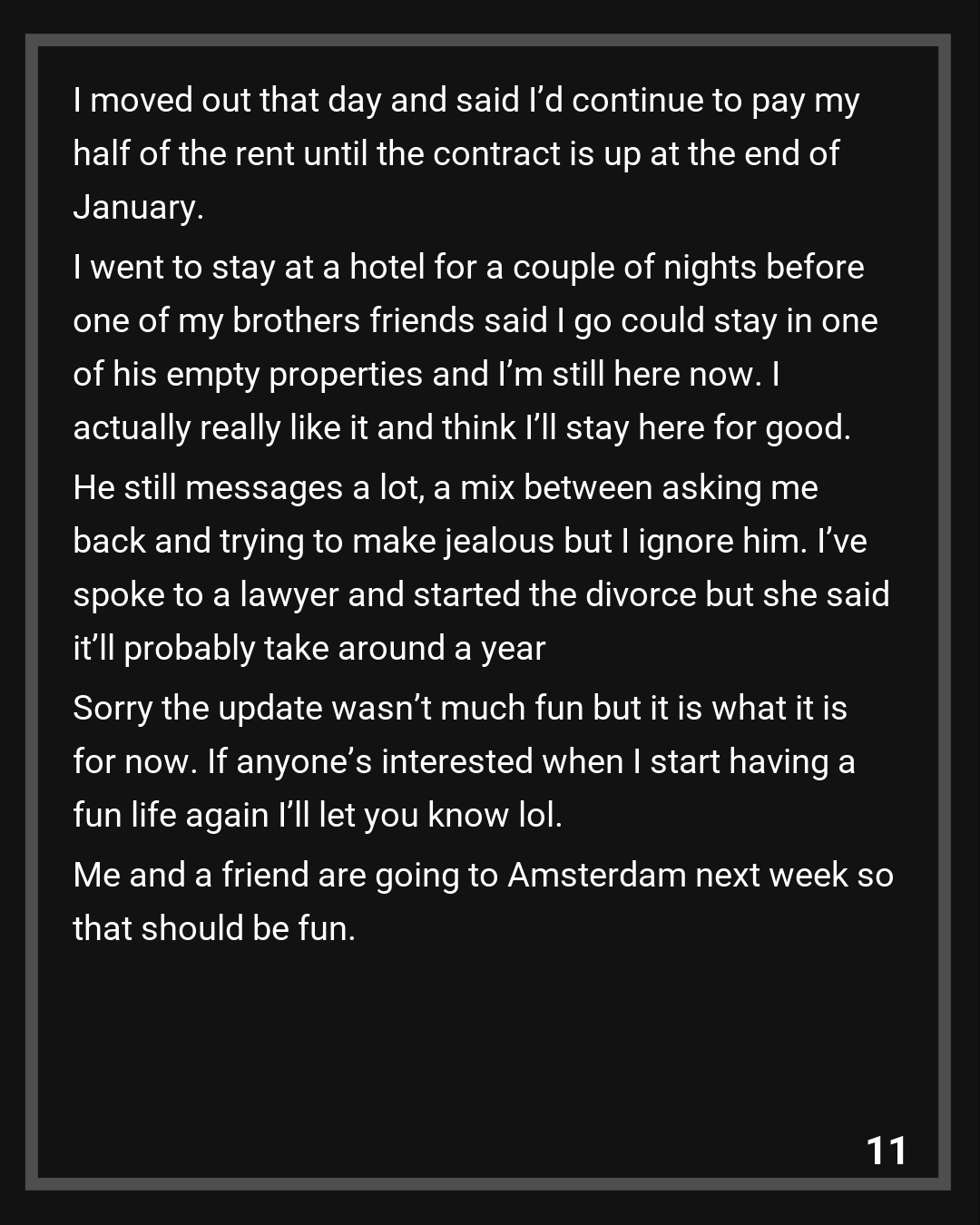 I moved out that day and said I’d continue to pay my half of the rent until the contract is up at the end of January. I went to stay at a hotel for a couple of nights before one of my brothers friends said I go could stay in one of his empty properties and I’m still here now. I actually really like it and think I’ll stay here for good.