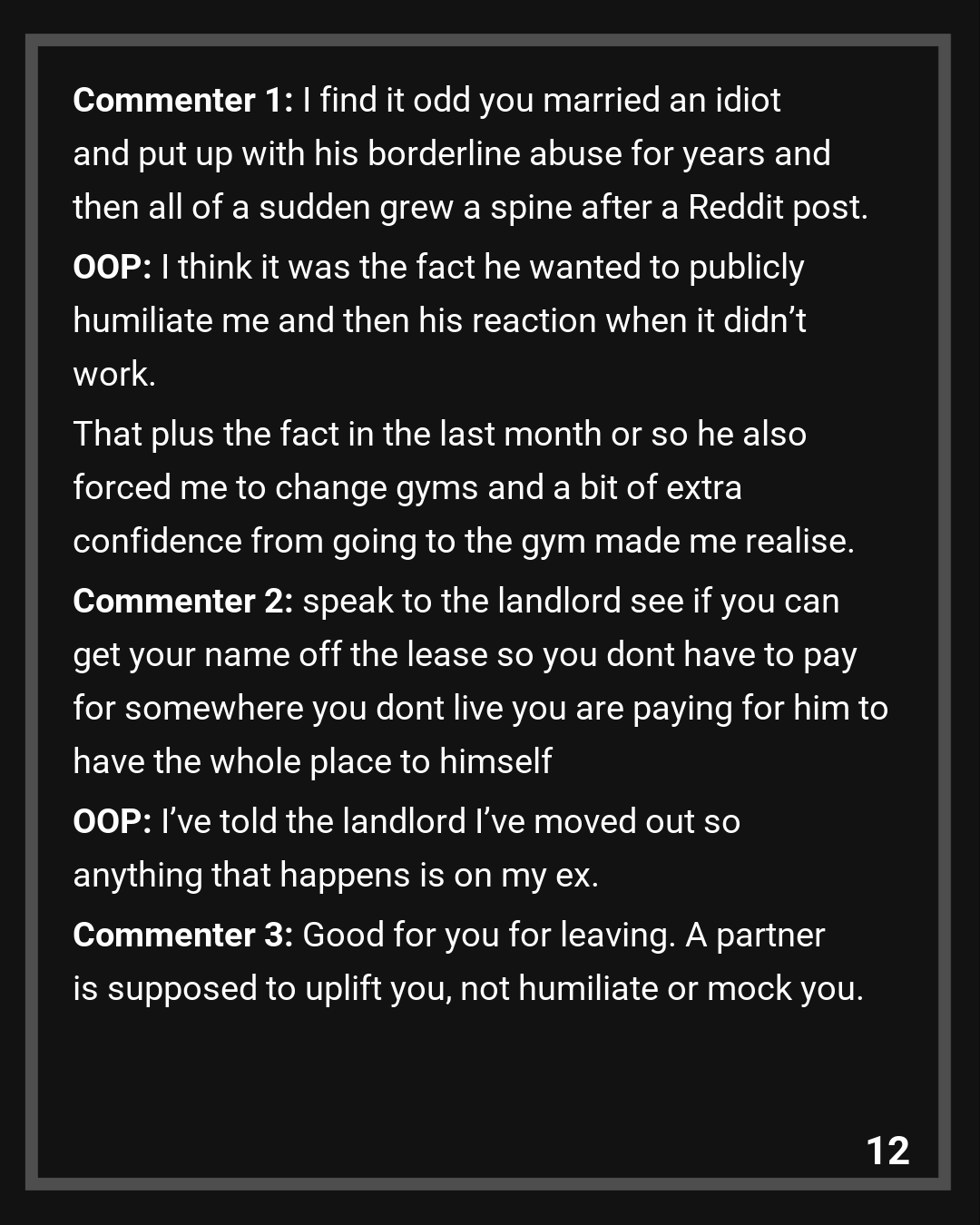 Commenter 1: I find it odd you married an idiot and put up with his borderline abuse for years and then all of a sudden grew a spine after a Reddit post.