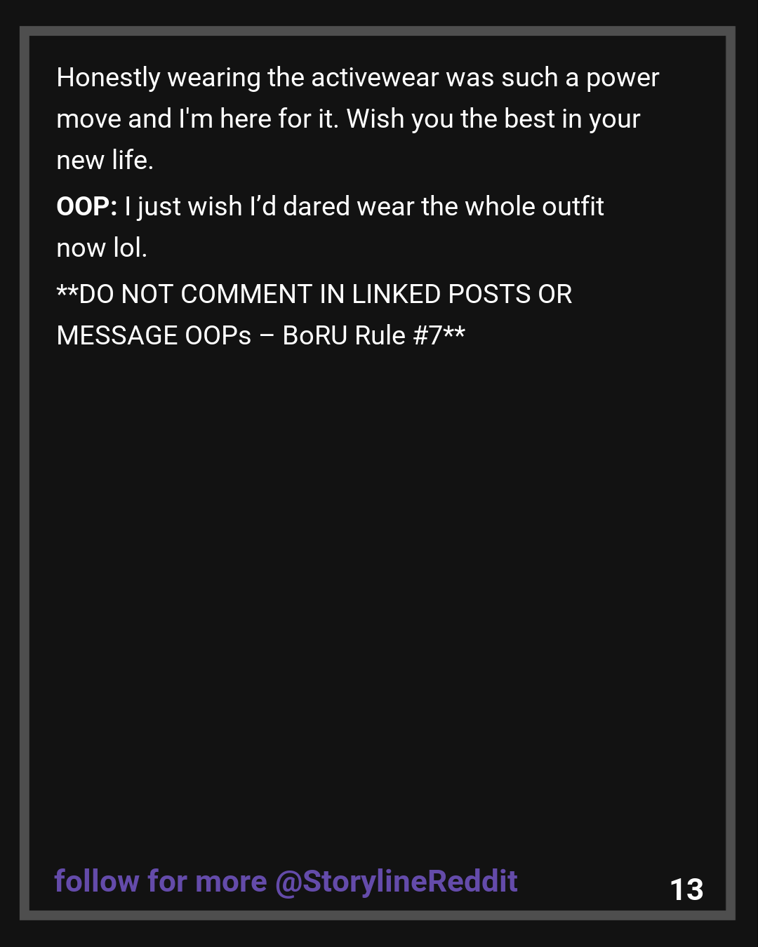 Commenter 3: Good for you for leaving. A partner is supposed to uplift you, not humiliate or mock you. Honestly wearing the activewear was such a power move and I’m here for it. Wish you the best in your new life.