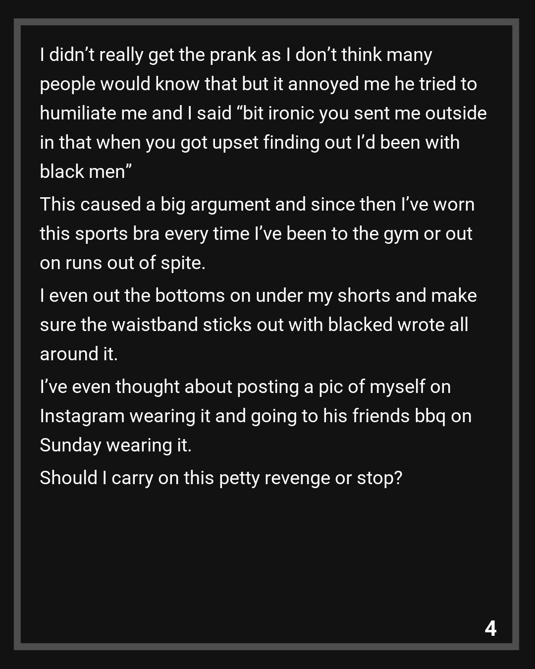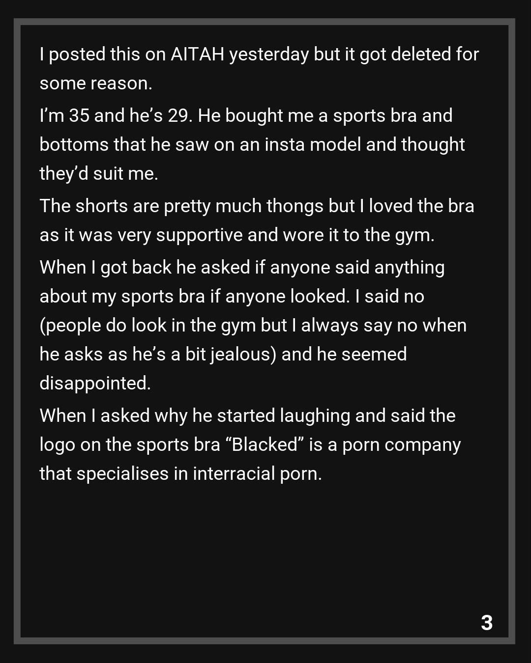 When I got back he asked if anyone said anything about my sports bra if anyone looked. I said no (people do look in the gym but I always say no when he asks as he’s a bit jealous) and he seemed disappointed. When I asked why he started laughing and said the logo on the sports bra “Blacked” is a porn company that specialises in interracial porn.