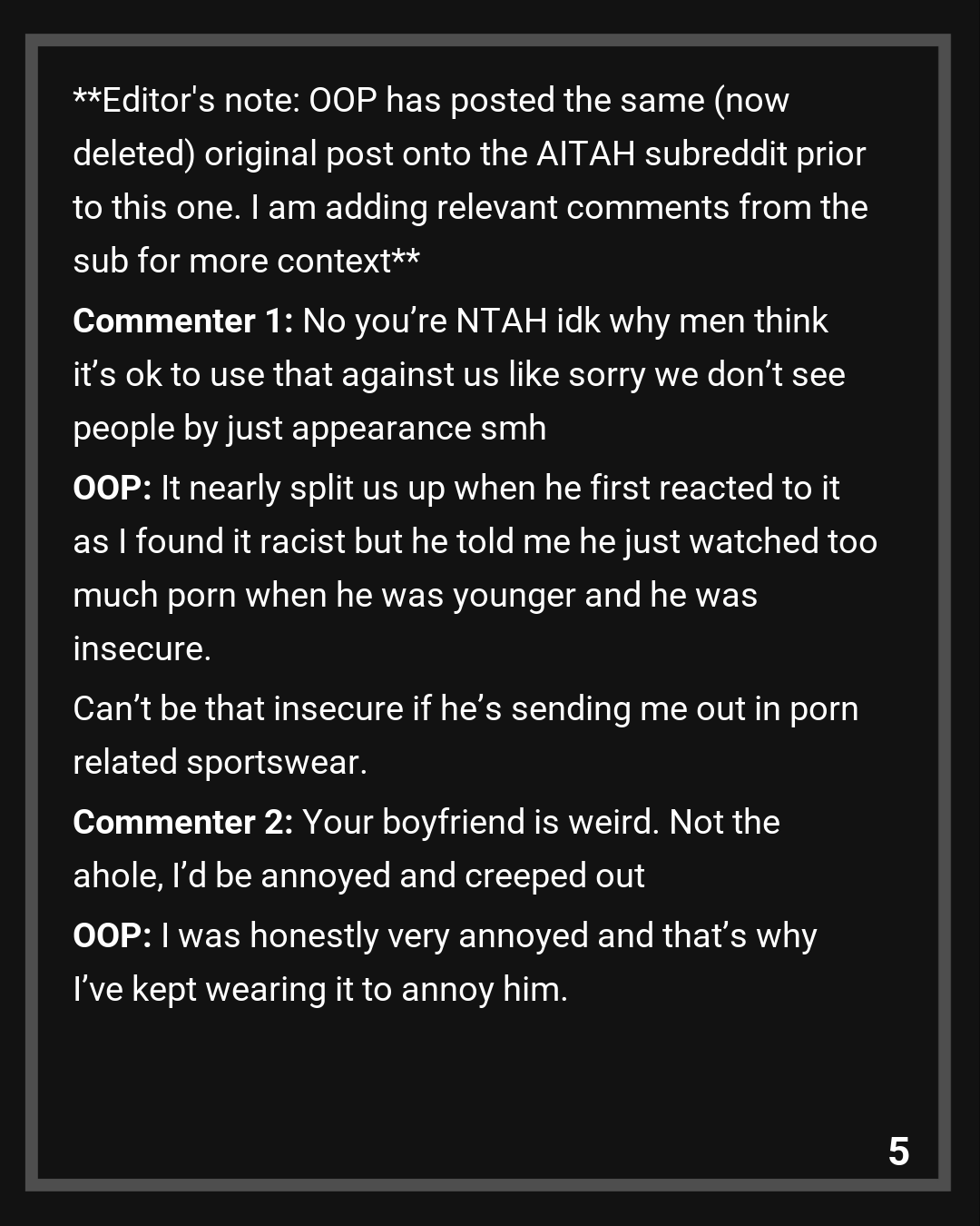 OOP: It nearly split us up when he first reacted to it as I found it racist but he told me he just watched too much porn when he was younger and he was insecure. Can’t be that insecure if he’s sending me out in porn related sportswear.