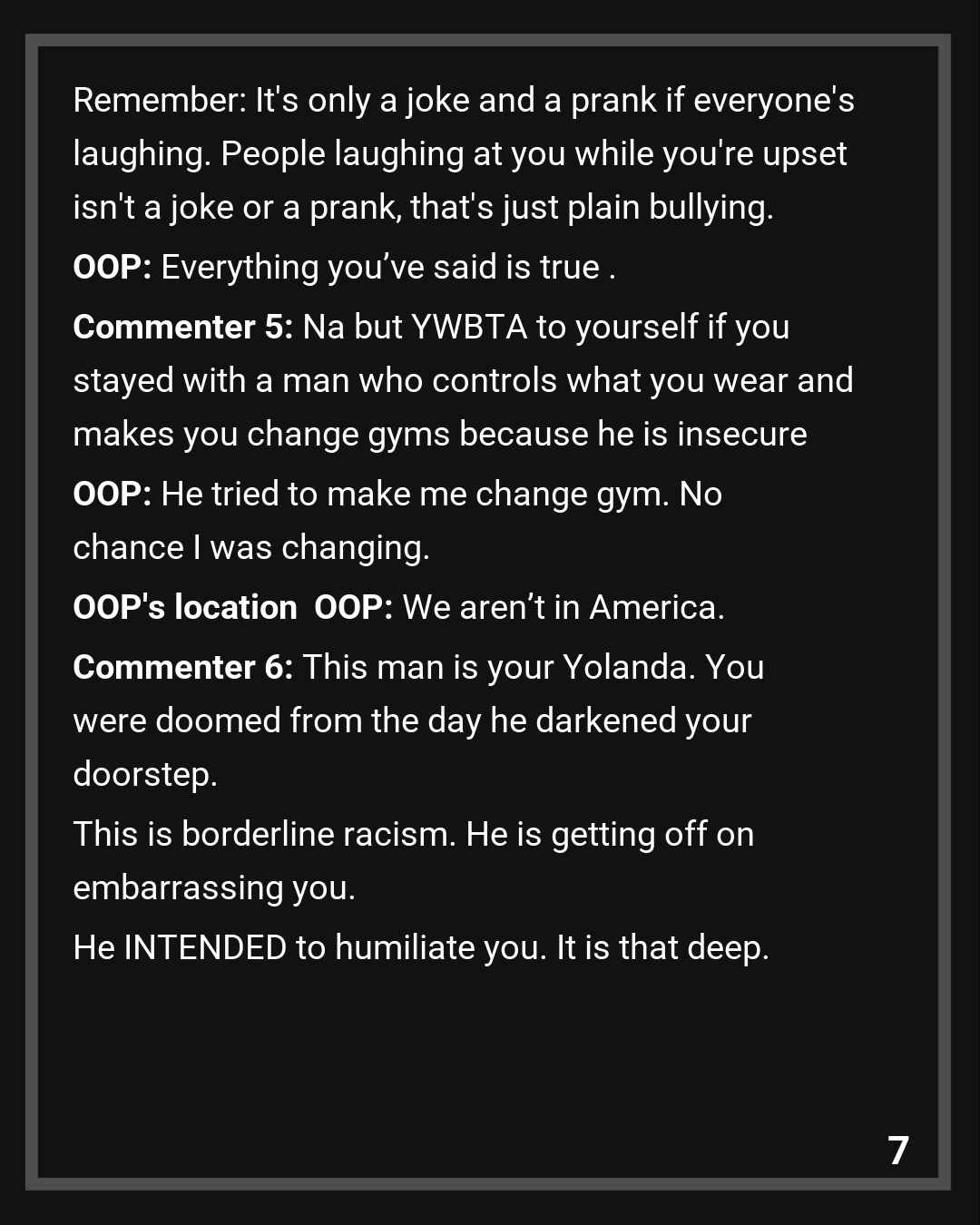 Commenter 6: This man is your Yolanda. You were doomed from the day he darkened your doorstep. This is borderline racism. He is getting off on embarrassing you. He INTENDED to humiliate you. It is that deep.