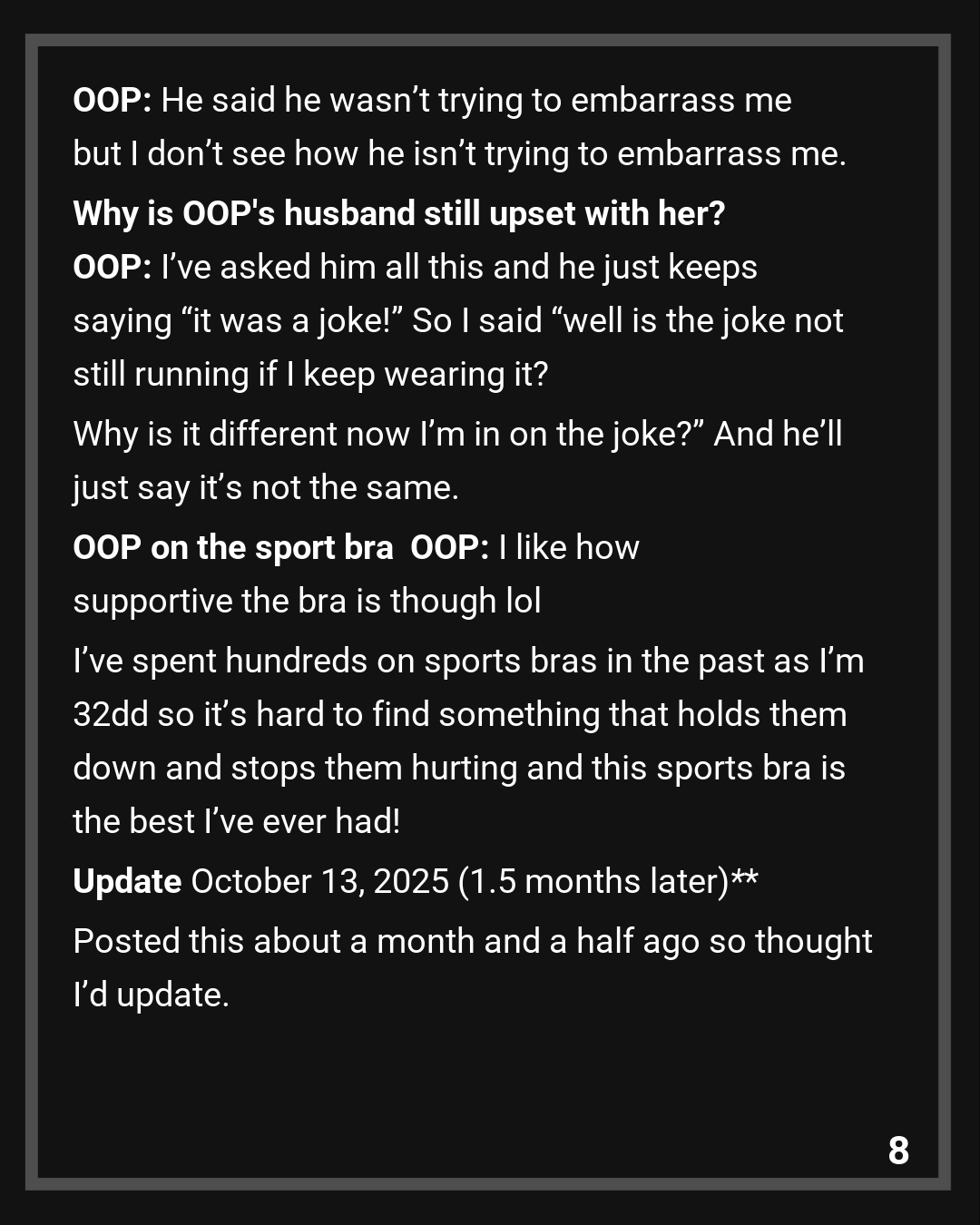 Being the idiot he is he said “what? Over a bra?” Not realising it was a build up of the way he was acting before all that. I reeled off a list off a list of stuff, trying to humiliate me with the prank in the first place, calling me “saggy tits” in front of his friends all the time, being jealous and possessive, belittling my hobbies and things I do for fun, constantly talking about women like shit and a few other things. All he would say was “well why didn’t you divorce me when that happened?” to every point which was annoying. His only defence was the saggy tit one when he said “they’ve seen your tits and like them so it’s only a joke” he did ask years ago if he could show them a pic and I said yes.