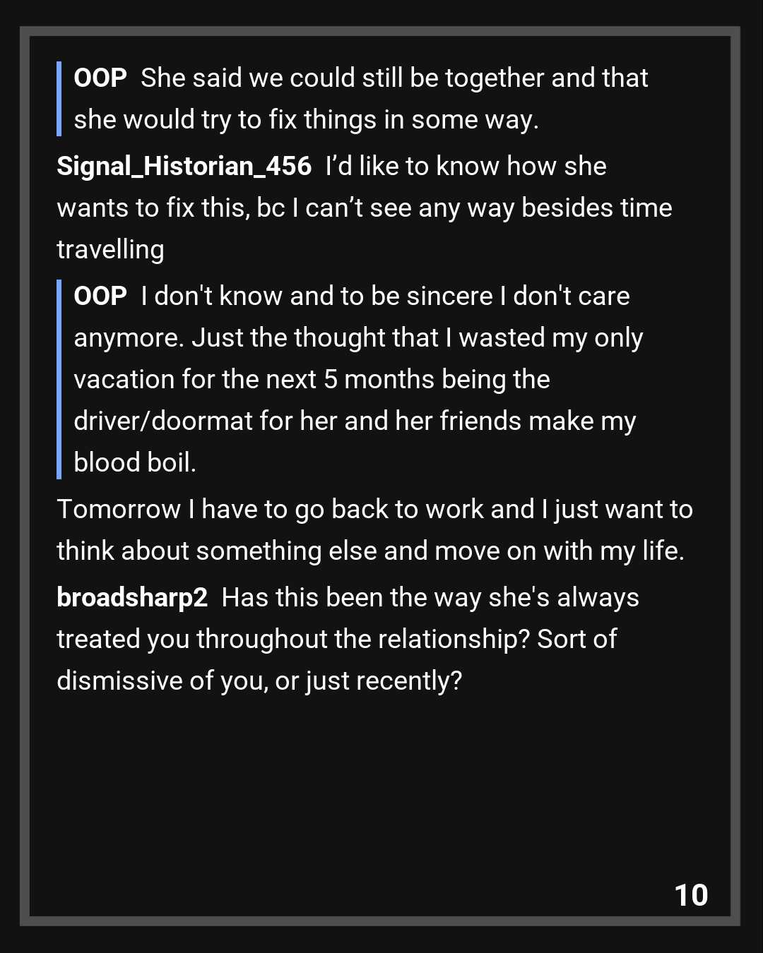 I don’t know and to be sincere I don’t care anymore. Just the thought that I wasted my only vacation for the next 5 months being the driver/doormat for her and her friends make my blood boil. Tomorrow I have to go back to work and I just want to think about something else and move on with my life.