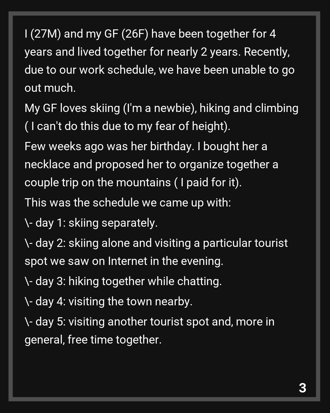 She invited her friend and the friend’s boyfriend. They skied. On the hike, she walked beside her friend and talked the whole way. The town visit happened as a group. On the fifth day the one set aside for just them she left in the morning for a climbing spot and returned in the evening, hours after she said she would.