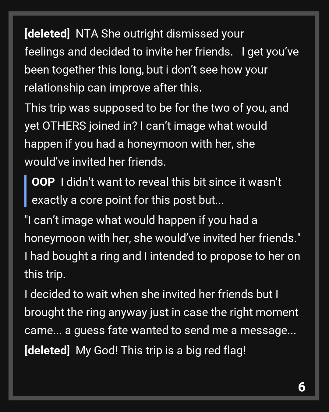 This trip was supposed to be for the two of you, and yet OTHERS joined in? I can’t image what would happen if you had a honeymoon with her, she would’ve invited her friends.