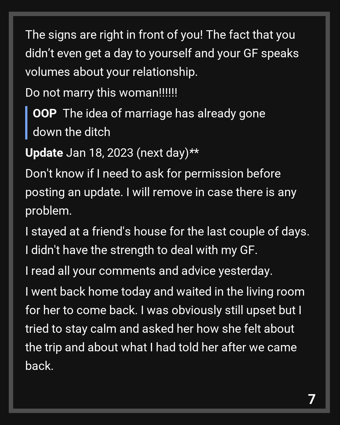 I stayed at a friend’s house for the last couple of days. I didn’t have the strength to deal with my GF. I read all your comments and advice yesterday.