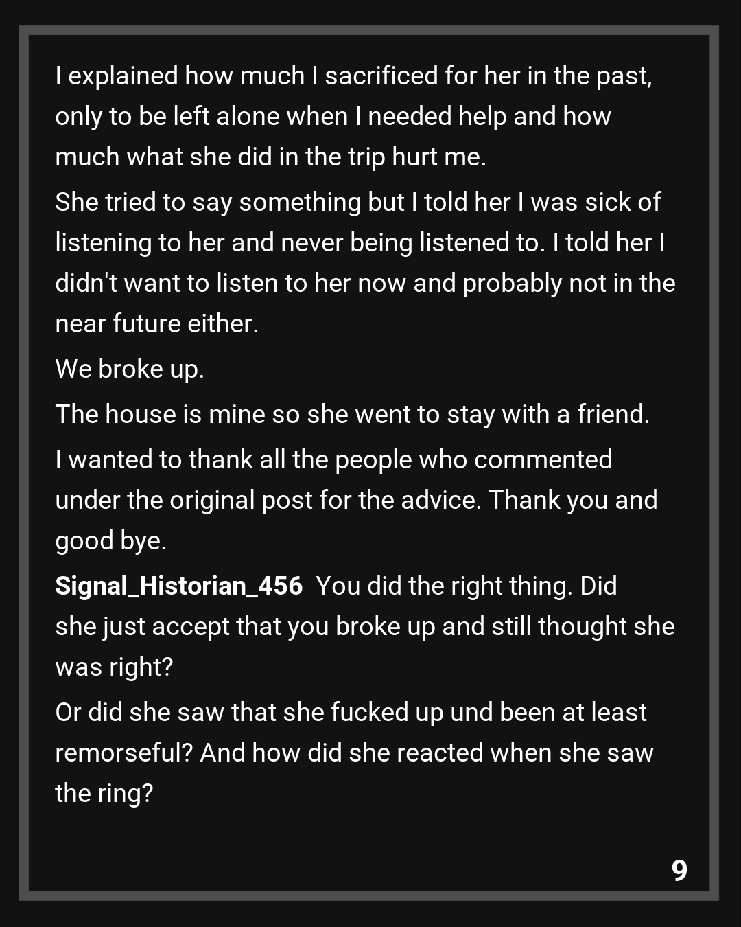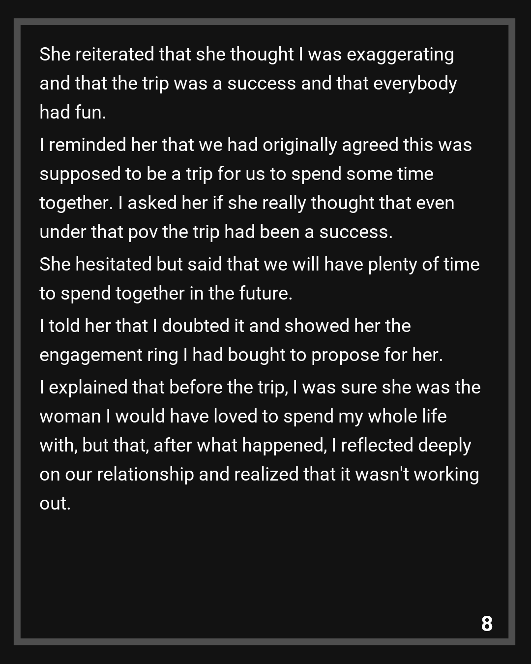 I told her that I doubted it and showed her the engagement ring I had bought to propose for her. I explained that before the trip, I was sure she was the woman I would have loved to spend my whole life with, but that, after what happened, I reflected deeply on our relationship and realized that it wasn’t working out. I explained how much I sacrificed for her in the past, only to be left alone when I needed help and how much what she did in the trip hurt me.