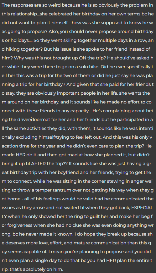 The dispute is less about skiing or climbing and more about what the trip was meant to represent. He initiated it as couple time something restorative, structured, theirs. She leaned into it as a birthday experience, open to expansion, shaped by what she enjoys most.