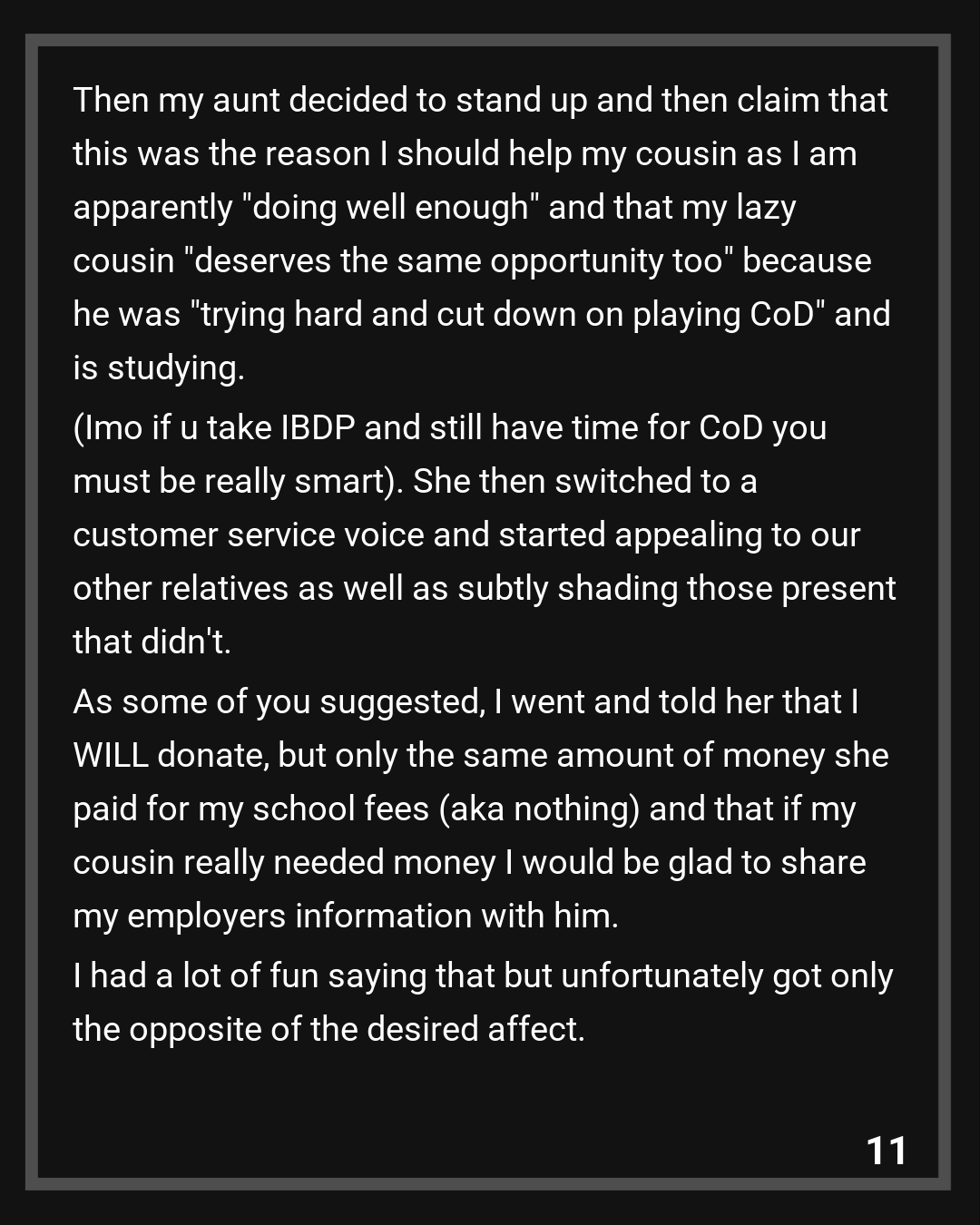 As some of you suggested, I went and told her that I WILL donate, but only the same amount of money she paid for my school fees (aka nothing) and that if my cousin really needed money I would be glad to share my employers information with him. I had a lot of fun saying that but unfortunately got only the opposite of the desired affect. My aunt went ballistic and started then blaming my mother for raising a “heartless and stupid” child and that I was now of the age to be a breadwinner for the family which she emphasised included HER.
