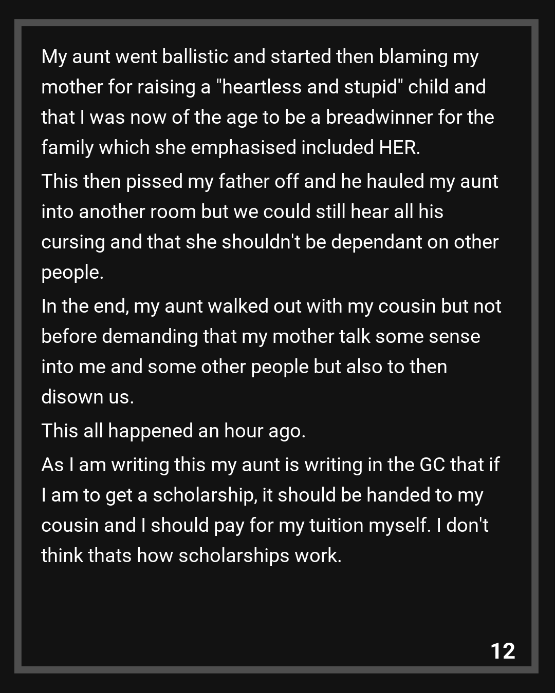 As I am writing this my aunt is writing in the GC that if I am to get a scholarship, it should be handed to my cousin and I should pay for my tuition myself. I don’t think thats how scholarships work.