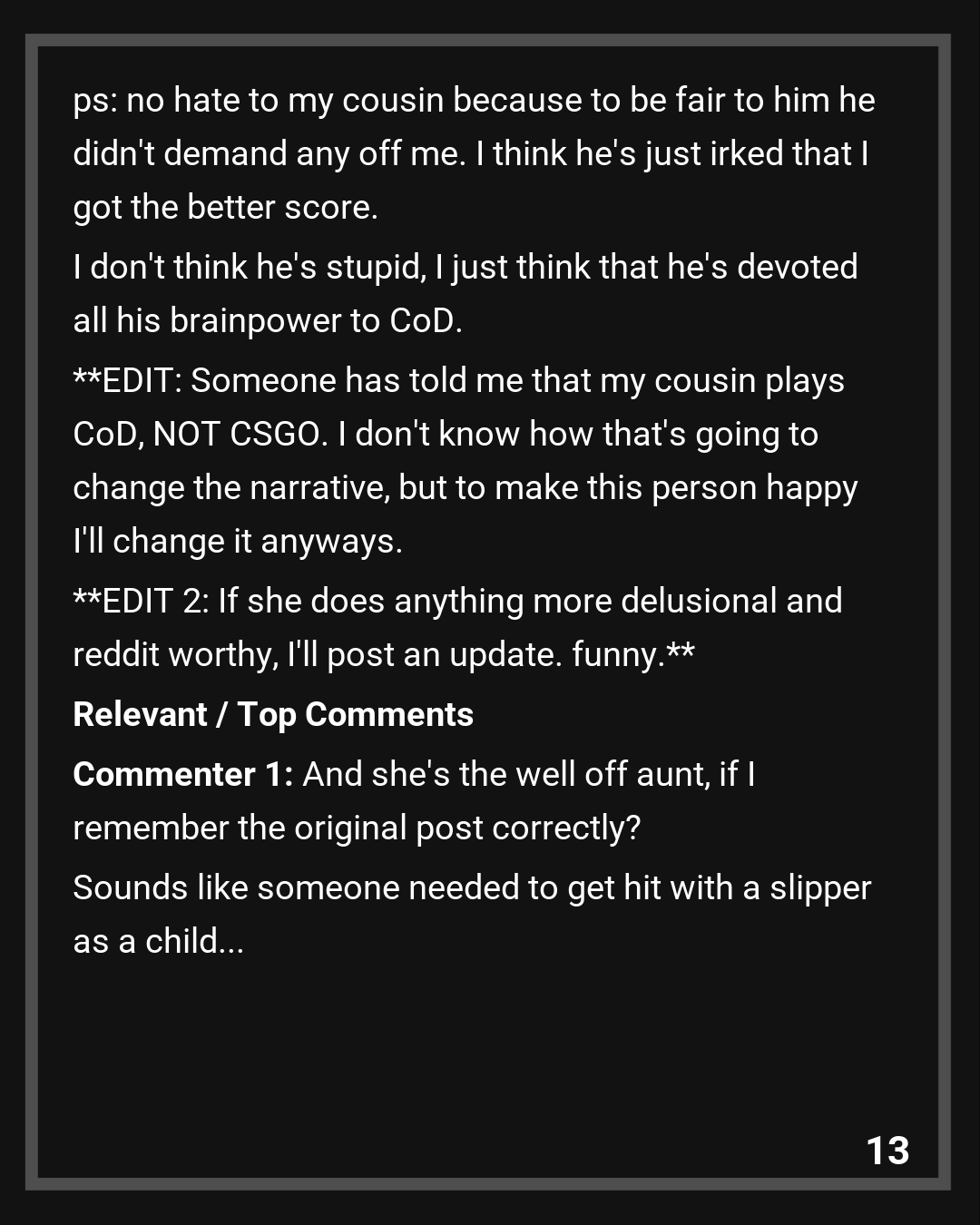 EDIT: Someone has told me that my cousin plays CoD, NOT CSGO. I don’t know how that’s going to change the narrative, but to make this person happy I’ll change it anyways. LMAO