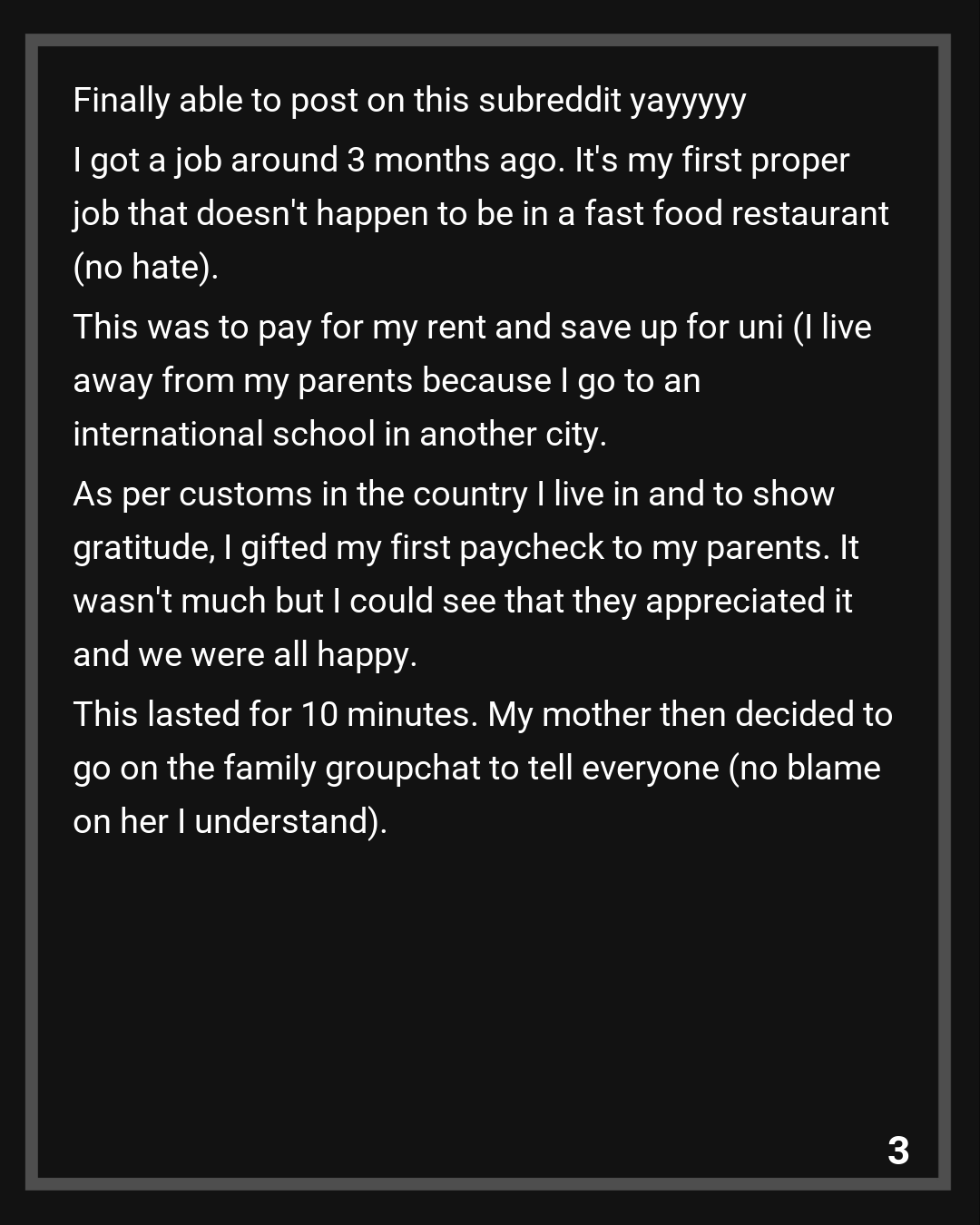 I got a job around 3 months ago. It’s my first proper job that doesn’t happen to be in a fast food restaurant (no hate). This was to pay for my rent and save up for uni (I live away from my parents because I go to an international school in another city. As per customs in the country I live in and to show gratitude, I gifted my first paycheck to my parents. It wasn’t much but I could see that they appreciated it and we were all happy. This lasted for 10 minutes. My mother then decided to go on the family groupchat to tell everyone (no blame on her I understand).
