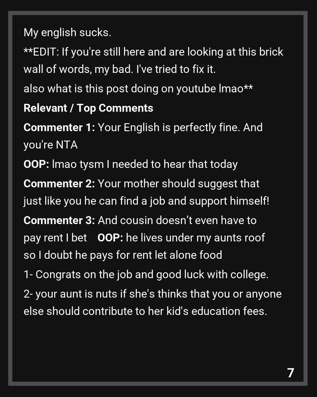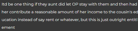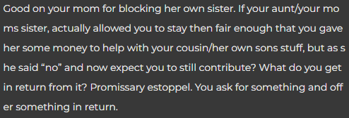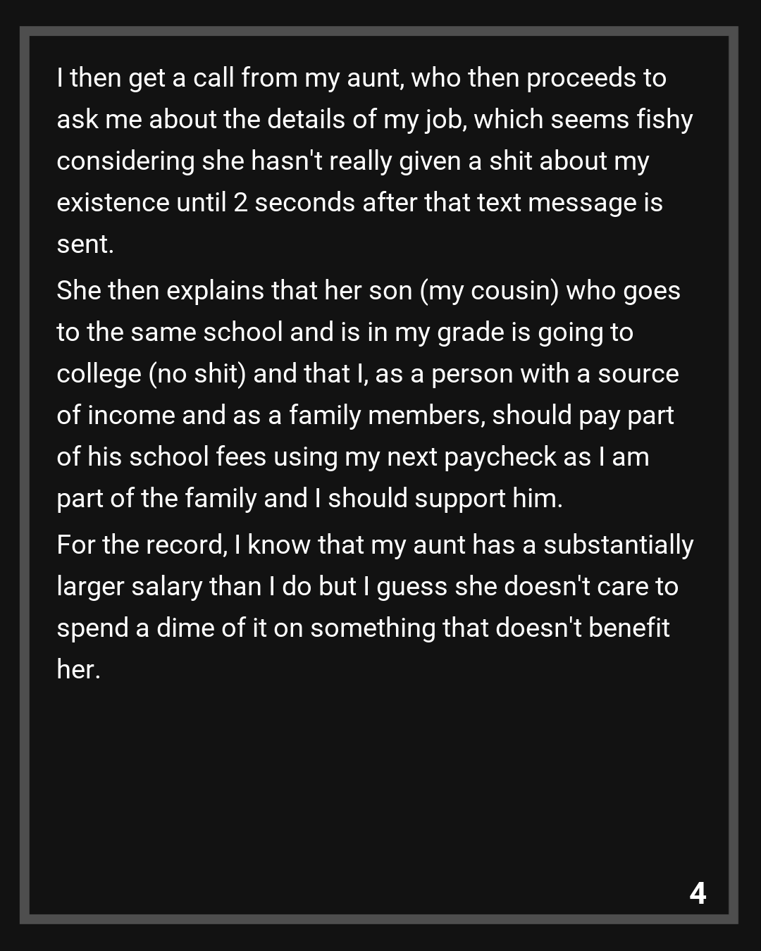 She then explains that her son (my cousin) who goes to the same school and is in my grade is going to college (no shit) and that I, as a person with a source of income and as a family members, should pay part of his school fees using my next paycheck as I am part of the family and I should support him.