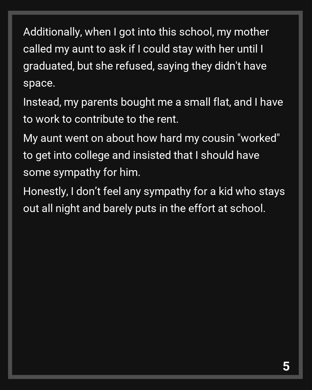 My aunt went on about how hard my cousin “worked” to get into college and insisted that I should have some sympathy for him. Honestly, I don’t feel any sympathy for a kid who stays out all night and barely puts in the effort at school.