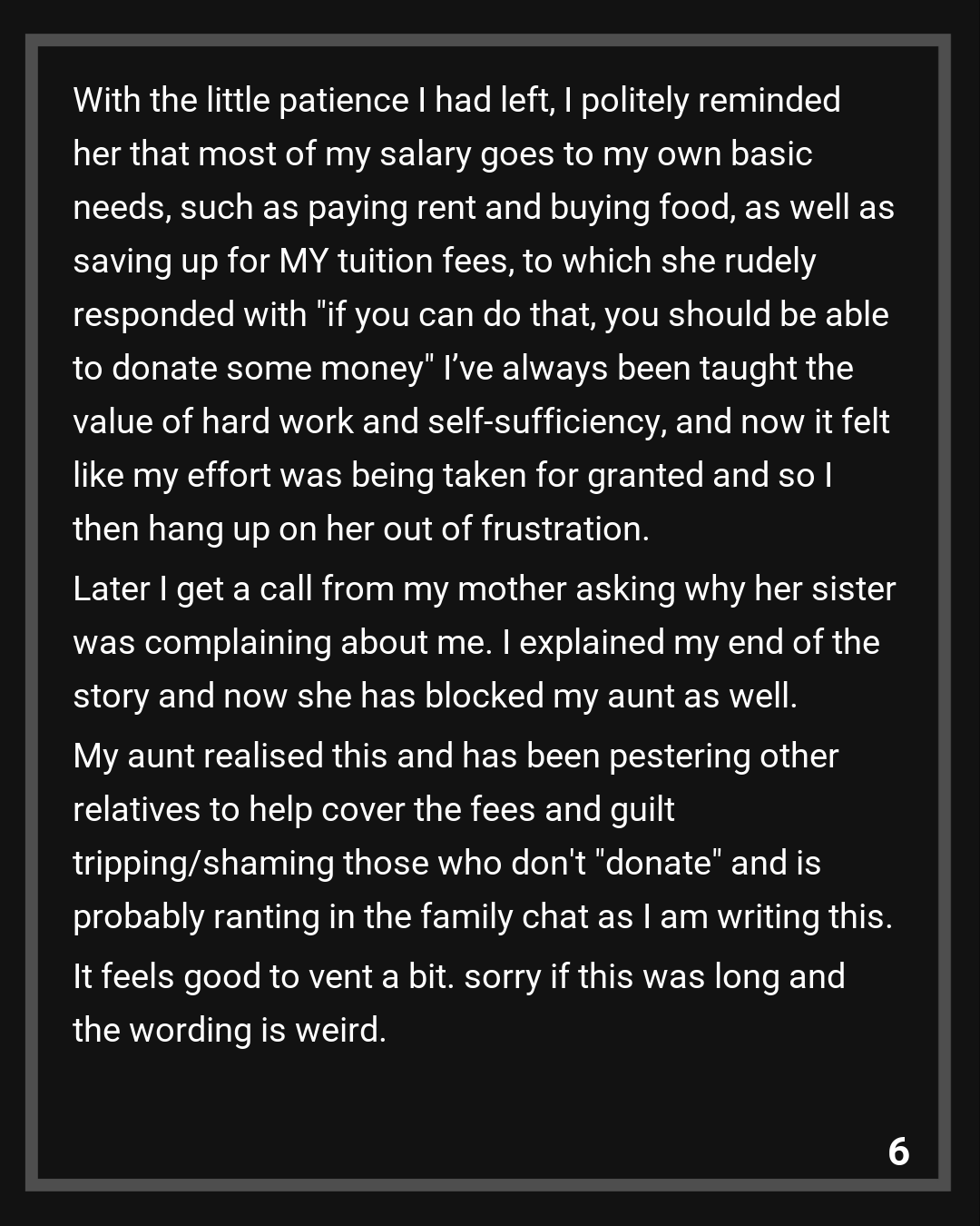 With the little patience I had left, I politely reminded her that most of my salary goes to my own basic needs, such as paying rent and buying food, as well as saving up for MY tuition fees, to which she rudely responded with “if you can do that, you should be able to donate some money” I’ve always been taught the value of hard work and self-sufficiency, and now it felt like my effort was being taken for granted and so I then hang up on her out of frustration.