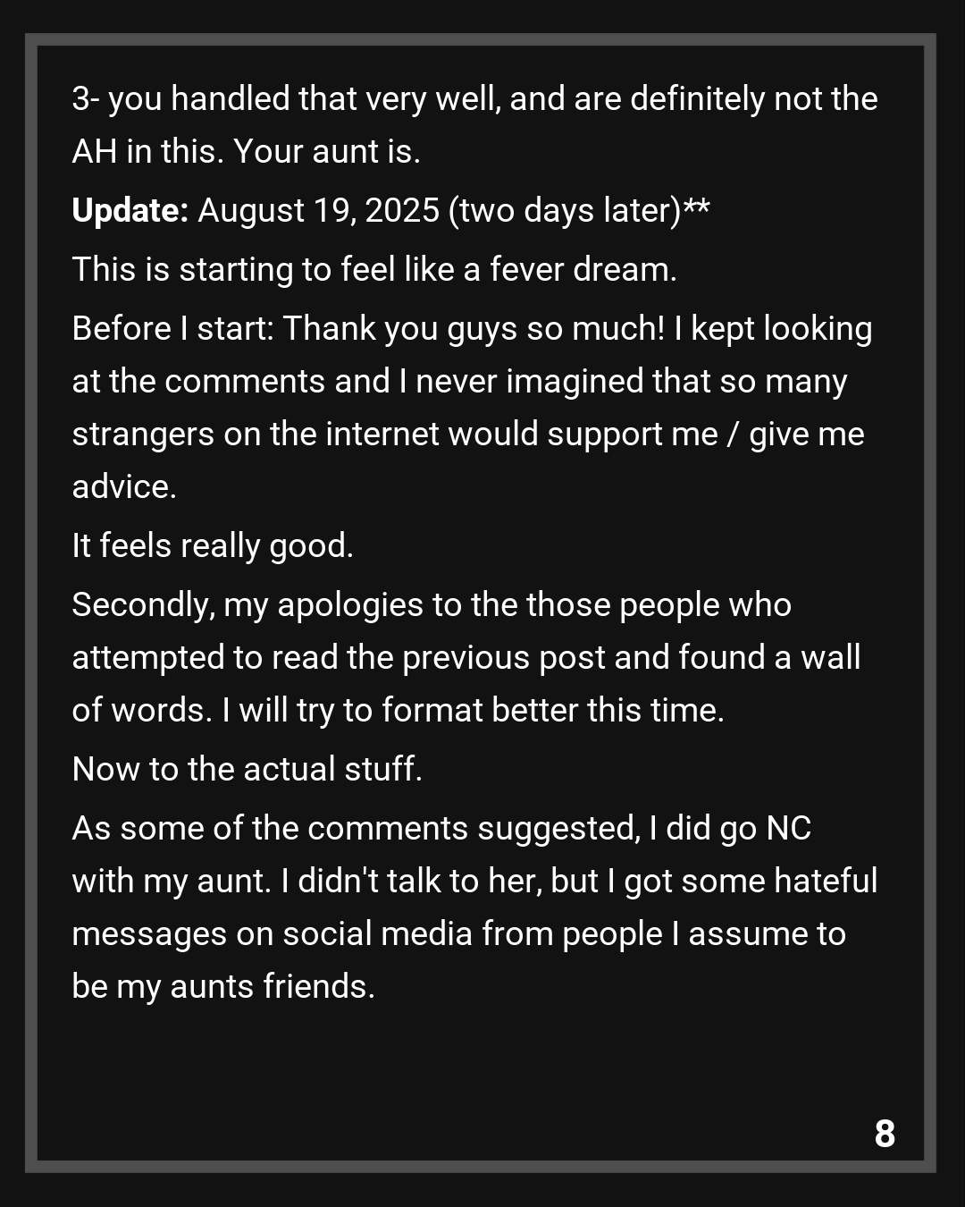 As some of the comments suggested, I did go NC with my aunt. I didn’t talk to her, but I got some hateful messages on social media from people I assume to be my aunts friends. This worked for a day until I realised to horrible timing of my last post. Our family has these gatherings for dinner around once every 4 or so months where all our extended family that is descended from my maternal grandmother gathers, usually at a relatives house. This time, it was my parents turn to host, and it felt good to go back because imo living alone isn’t fun.