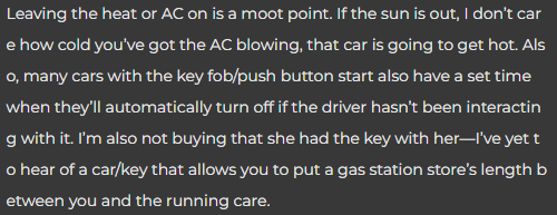 I guess I should clarify that the car was running with the air on. I forgot to add that detail and was restricted by the character limit- but the car was on. It’s a push-to-start car with a sensor for the key fob so it’ll stay on/running as long as you are close enough to the vehicle. I didn’t see the keys in the car so she took them inside with her, but didn’t lock it.