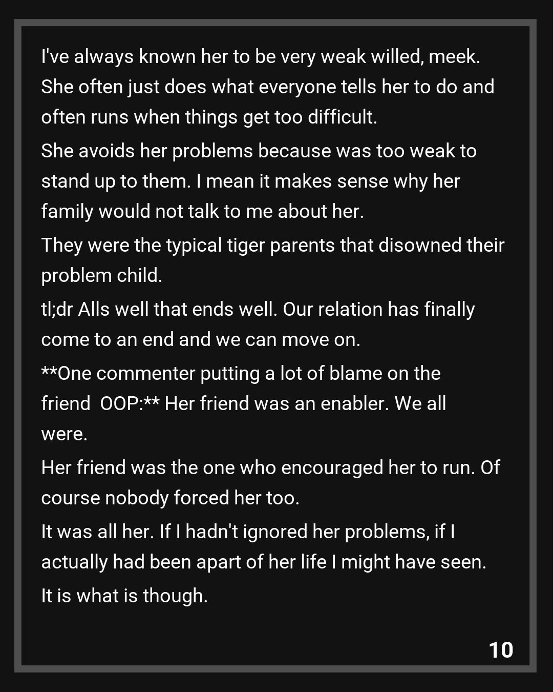 Do I believe her story? Yes, I do and even if she’s full of shit at this point does it even matter? I’ve always known her to be very weak willed, meek. She often just does what everyone tells her to do and often runs when things get too difficult. She avoids her problems because was too weak to stand up to them. I mean it makes sense why her family would not talk to me about her. They were the typical tiger parents that disowned their problem child.