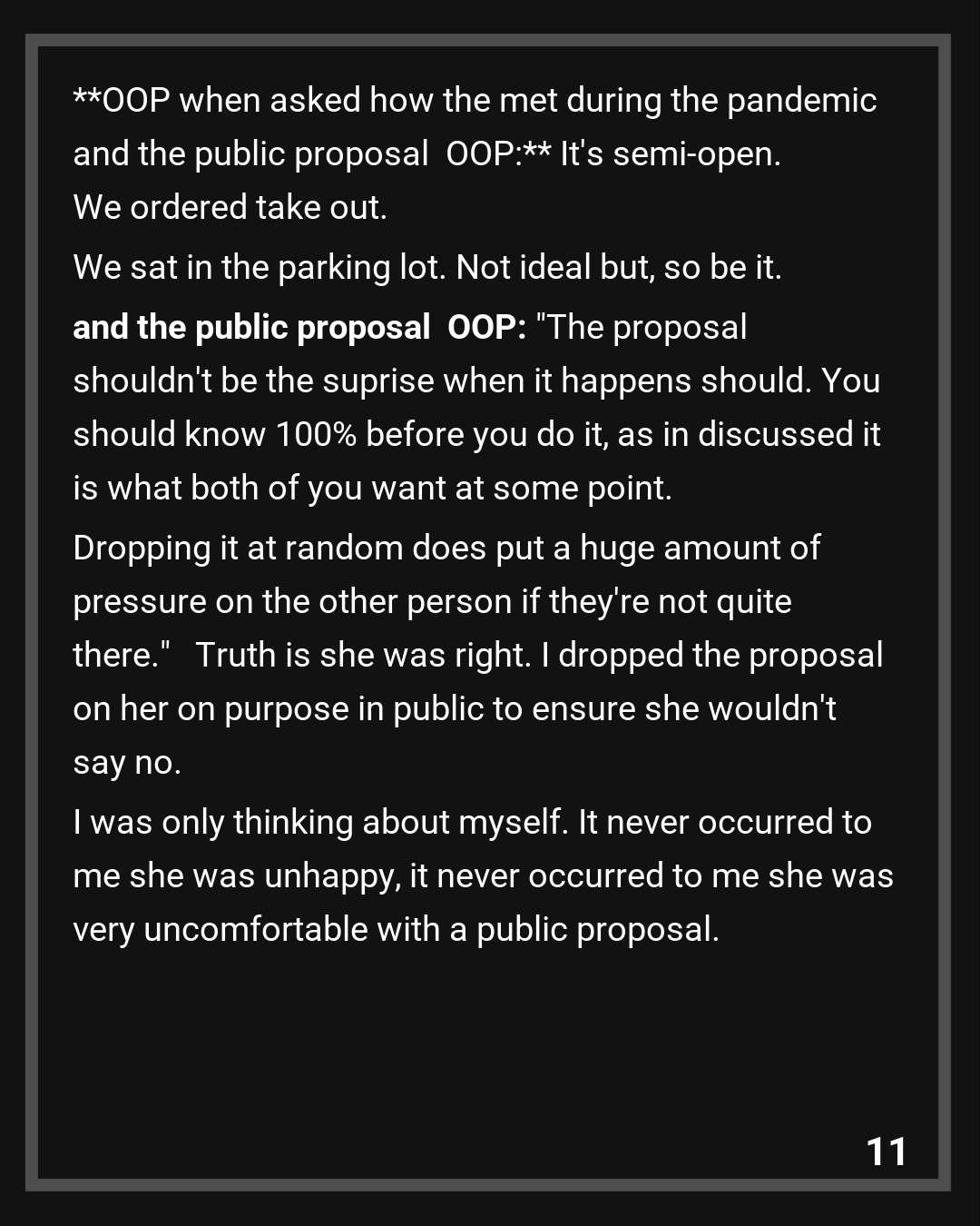 OOP: “The proposal shouldn’t be the suprise when it happens should. You should know 100% before you do it, as in discussed it is what both of you want at some point. Dropping it at random does put a huge amount of pressure on the other person if they’re not quite there.”