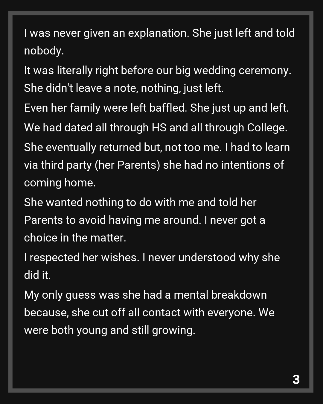 I was never given an explanation. She just left and told nobody. It was literally right before our big wedding ceremony. She didn’t leave a note, nothing, just left. Even her family were left baffled. She just up and left. We had dated all through HS and all through College.