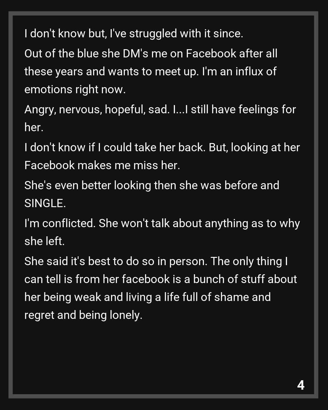 Out of the blue she DM’s me on Facebook after all these years and wants to meet up. I’m an influx of emotions right now. Angry, nervous, hopeful, sad. I…I still have feelings for her. I don’t know if I could take her back. But, looking at her Facebook makes me miss her. She’s even better looking then she was before and SINGLE.