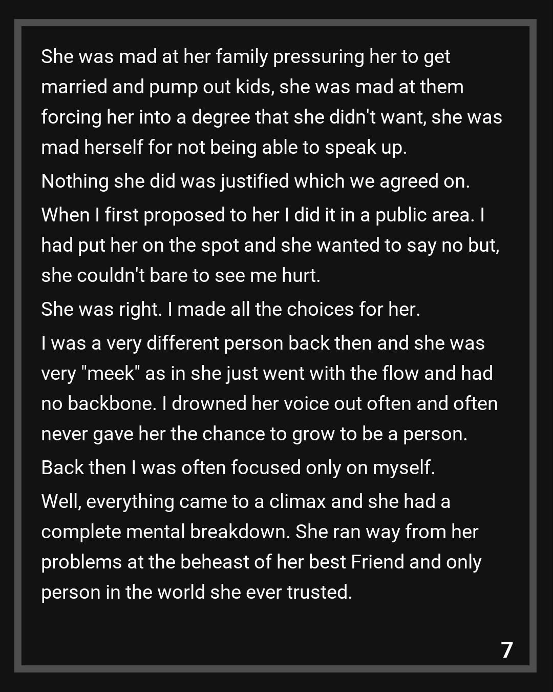 We met at a cafe and sat and talked outside. The first thing I noticed was how badly scarred her arms were and how much pain was in her face. Long story short she wanted to break up long before the wedding, she was too weak and cowardly to speak up for herself. She had a complete nervous breakdown over everything. She had been tired of being forced into doing things she never wanted to do and never having the guts to stand up for herself. She was mad at her family pressuring her to get married and pump out kids, she was mad at them forcing her into a degree that she didn’t want, she was mad herself for not being able to speak up. Nothing she did was justified which we agreed on.