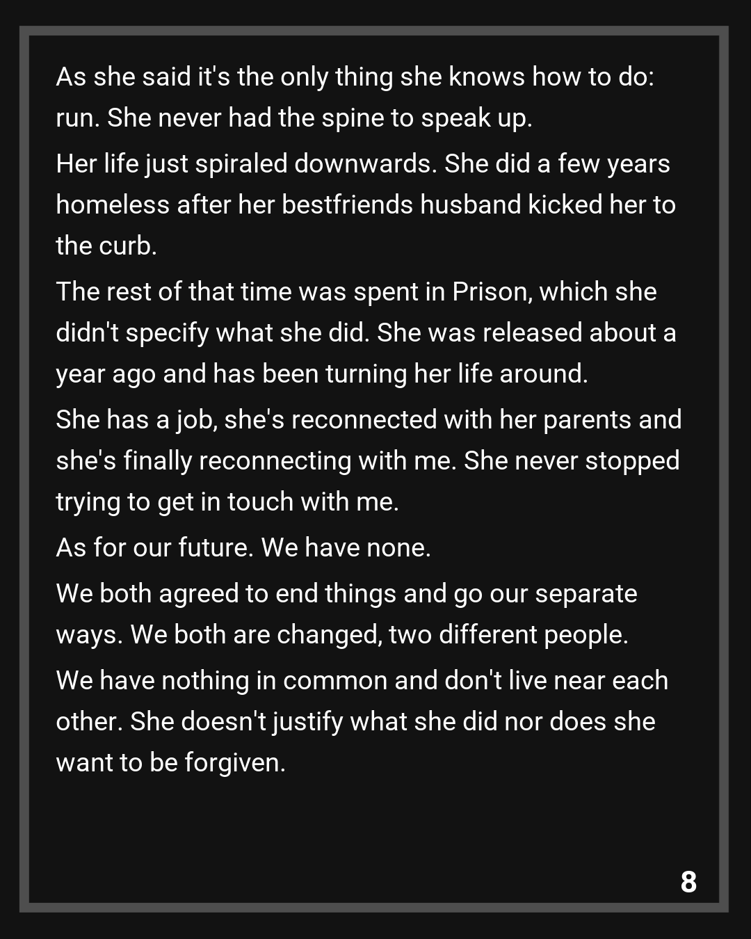 Her life just spiraled downwards. She did a few years homeless after her bestfriends husband kicked her to the curb. The rest of that time was spent in Prison, which she didn’t specify what she did. She was released about a year ago and has been turning her life around. She has a job, she’s reconnected with her parents and she’s finally reconnecting with me. She never stopped trying to get in touch with me.