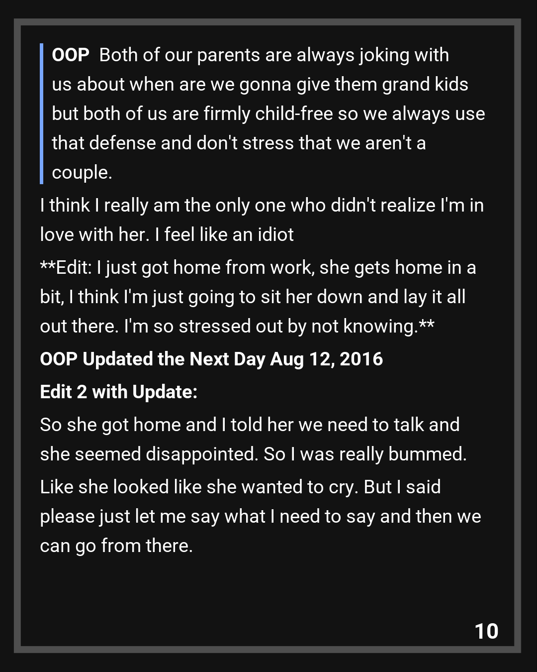 Both of our parents are always joking with us about when are we gonna give them grand kids but both of us are firmly child-free so we always use that defense and don’t stress that we aren’t a couple. I think I really am the only one who didn’t realize I’m in love with her. I feel like an idiot