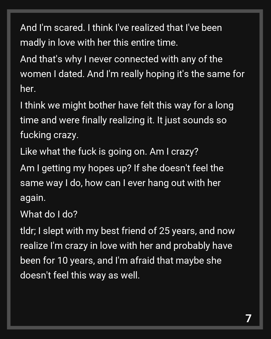 tldr; I slept with my best friend of 25 years, and now realize I’m crazy in love with her and probably have been for 10 years, and I’m afraid that maybe she doesn’t feel this way as well.