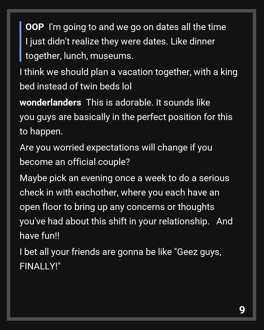 I’m going to and we go on dates all the time I just didn’t realize they were dates. Like dinner together, lunch, museums. I think we should plan a vacation together, with a king bed instead of twin beds lol