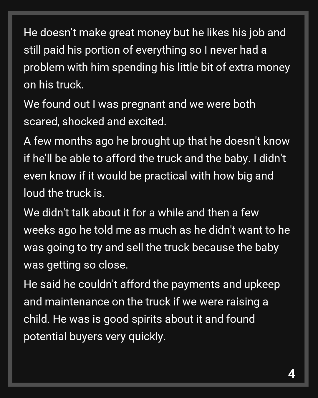 A few months ago he brought up that he doesn’t know if he’ll be able to afford the truck and the baby. I didn’t even know if it would be practical with how big and loud the truck is. We didn’t talk about it for a while and then a few weeks ago he told me as much as he didn’t want to he was going to try and sell the truck because the baby was getting so close. He said he couldn’t afford the payments and upkeep and maintenance on the truck if we were raising a child. He was is good spirits about it and found potential buyers very quickly. He sold it a couple days later for what he wanted and bought a car the next day.