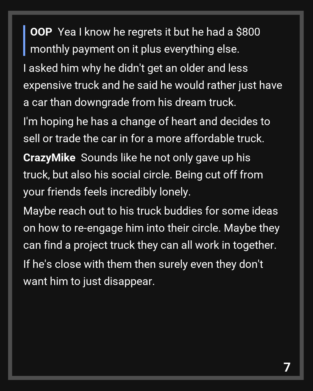 Yea I know he regrets it but he had a $800 monthly payment on it plus everything else. I asked him why he didn’t get an older and less expensive truck and he said he would rather just have a car than downgrade from his dream truck. I’m hoping he has a change of heart and decides to sell or trade the car in for a more affordable truck.