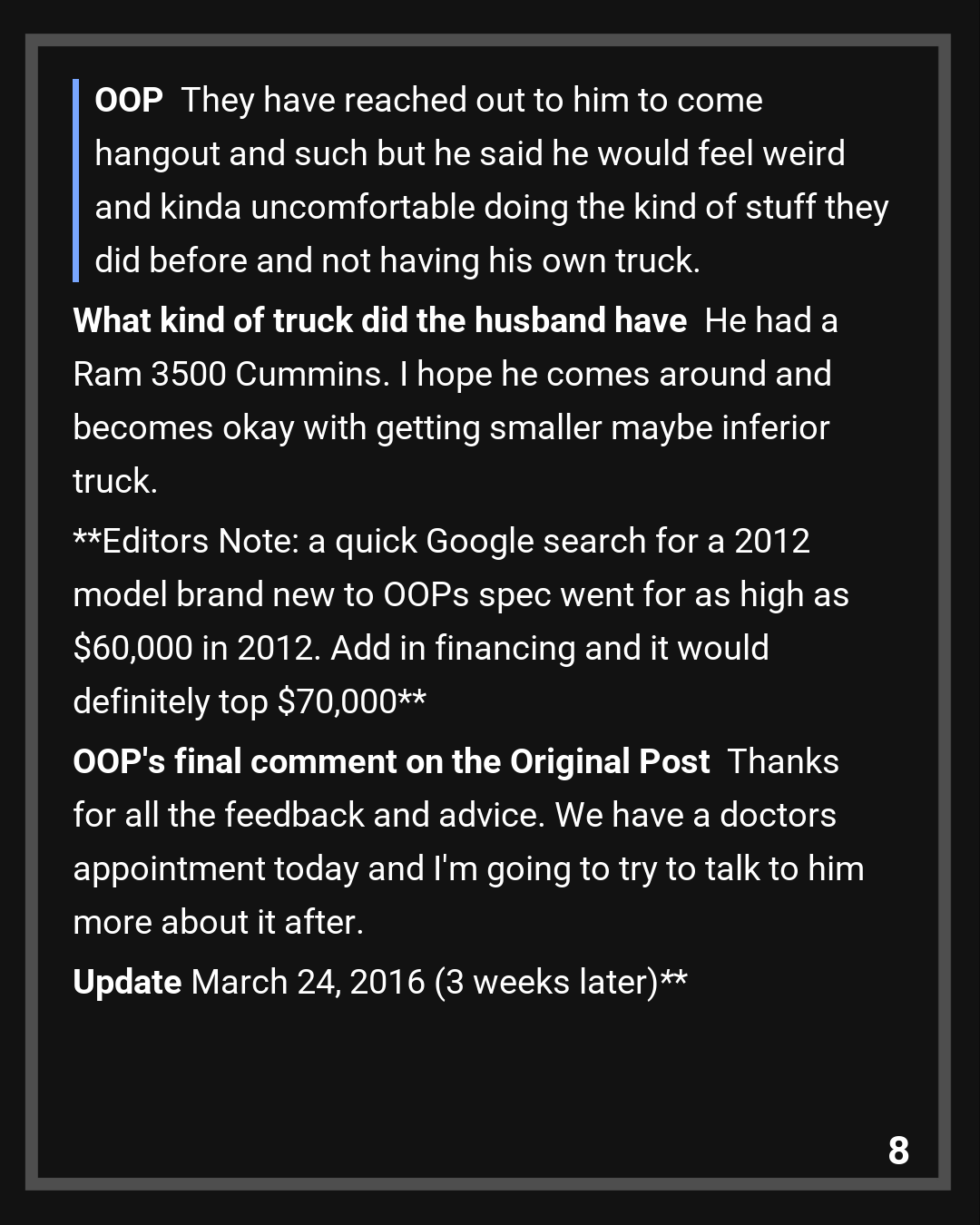I wanted to post an update because it’s nice reading positive outcomes on here. I got a lot of responses and it really helped me better understand what he was going thru. We were finally able to have a good talk about it. He told me what a lot of you said. That truck was his identity and part of who he was.