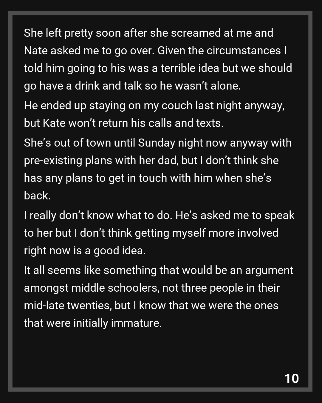 She doesn’t want to see Nate again, and while she forgives me for the name thing she doesn’t really want to drop everything and be best friends. That’s fair. She’s asked me to gather her stuff from Nate’s house and meet her for a chat. She told me she won’t make decisions for me but hopes I’ll reconsider my friendship after all this.
