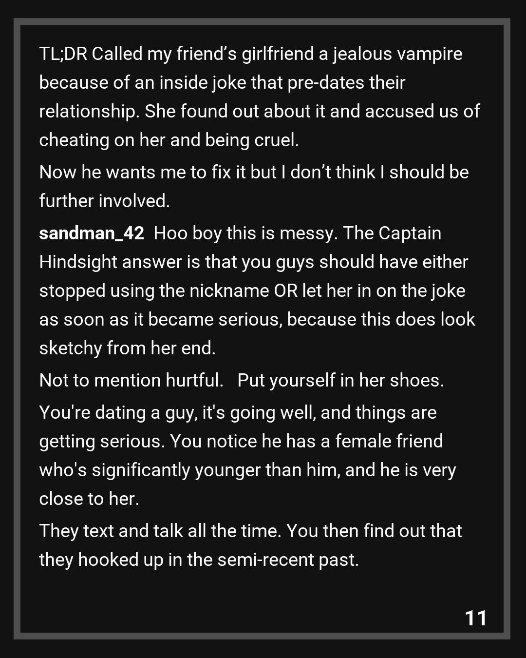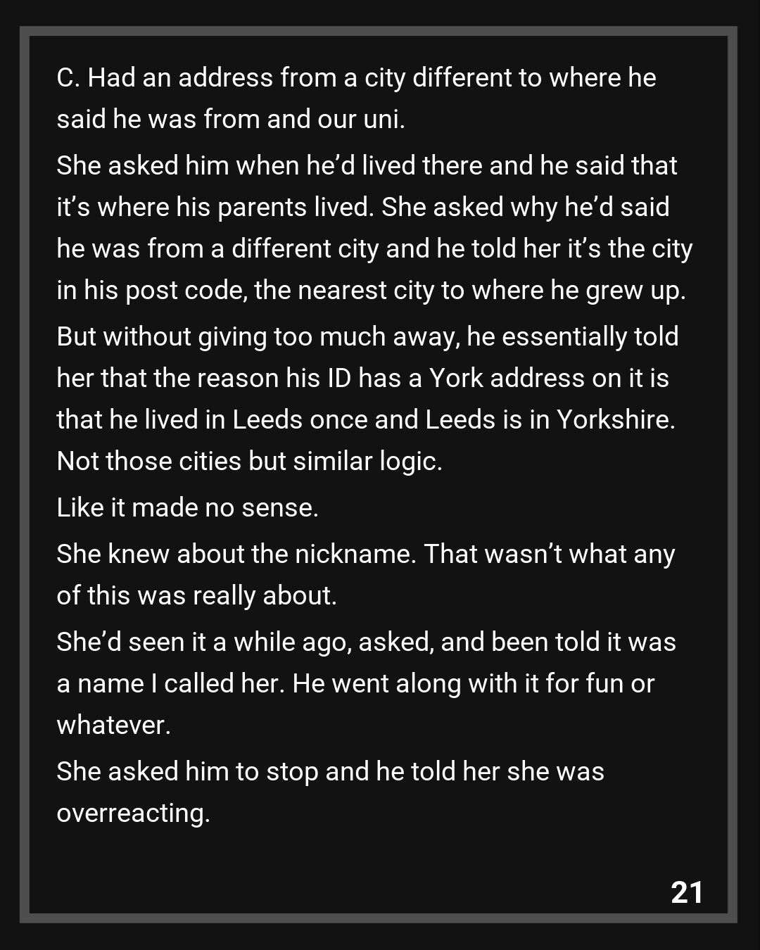She knew about the nickname. That wasn’t what any of this was really about. She’d seen it a while ago, asked, and been told it was a name I called her. He went along with it for fun or whatever. She asked him to stop and he told her she was overreacting.