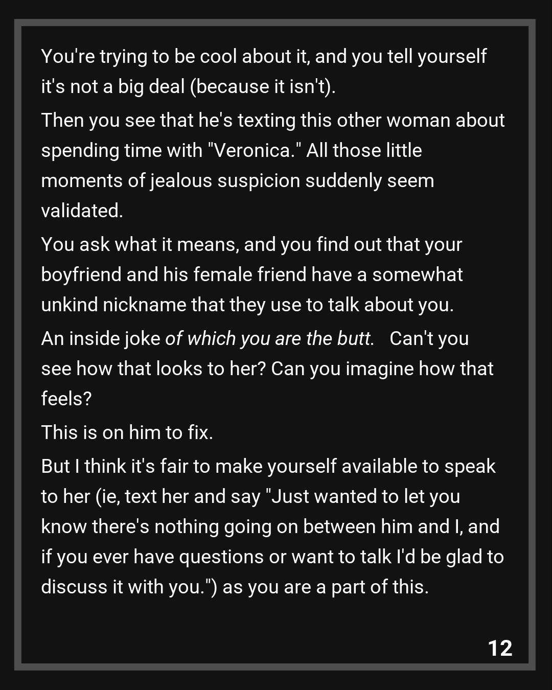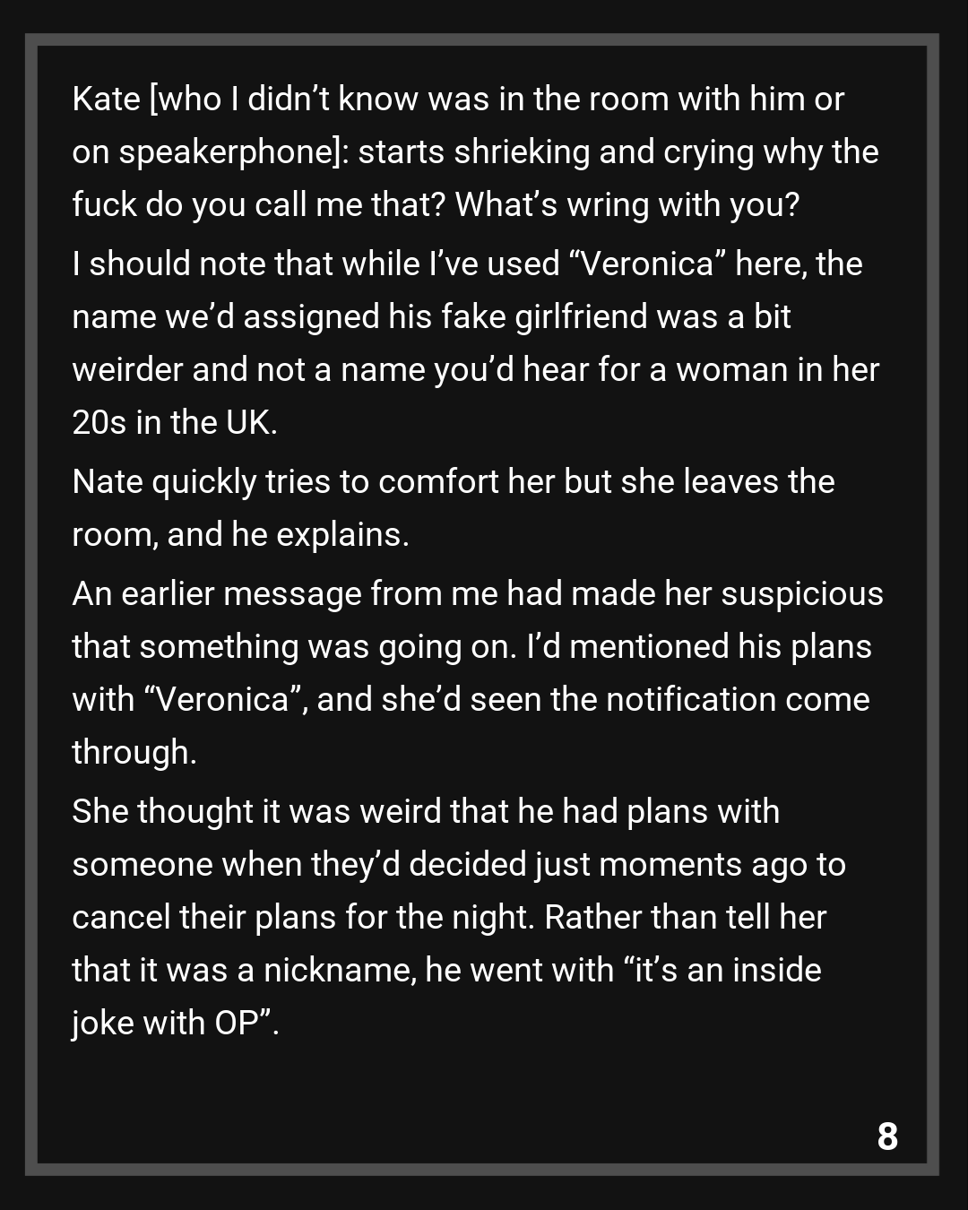 An earlier message from me had made her suspicious that something was going on. I’d mentioned his plans with “Veronica”, and she’d seen the notification come through. She thought it was weird that he had plans with someone when they’d decided just moments ago to cancel their plans for the night. Rather than tell her that it was a nickname, he went with “it’s an inside joke with OP”.