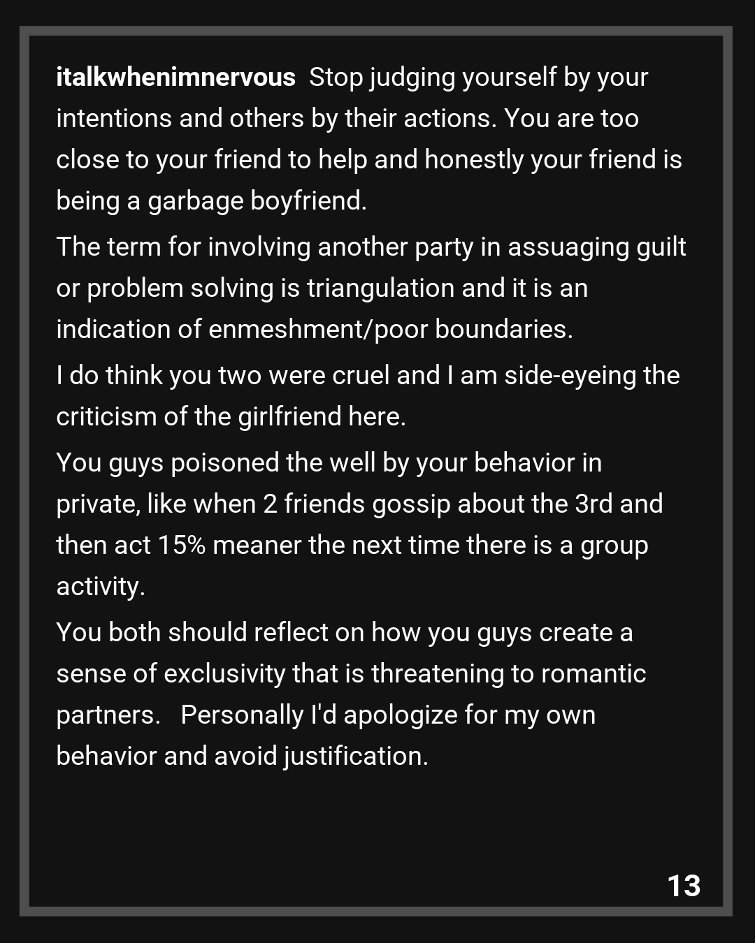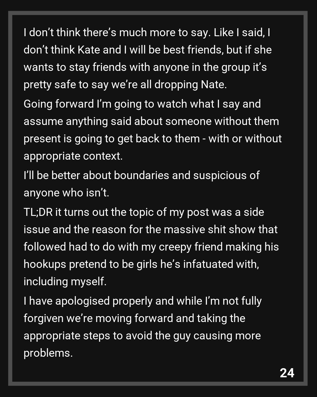 I don’t think there’s much more to say. Like I said, I don’t think Kate and I will be best friends, but if she wants to stay friends with anyone in the group it’s pretty safe to say we’re all dropping Nate. Going forward I’m going to watch what I say and assume anything said about someone without them present is going to get back to them – with or without appropriate context. I’ll be better about boundaries and suspicious of anyone who isn’t.