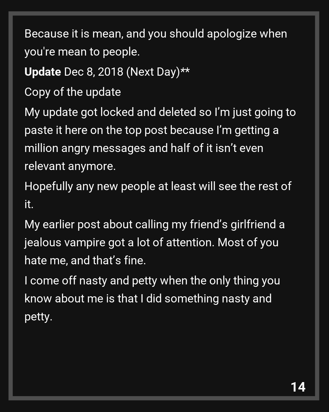 My earlier post about calling my friend’s girlfriend a jealous vampire got a lot of attention. Most of you hate me, and that’s fine. I come off nasty and petty when the only thing you know about me is that I did something nasty and petty. I could write you a novel about how I saved a kitten once or whatever but it wouldn’t change anything relevant to this.