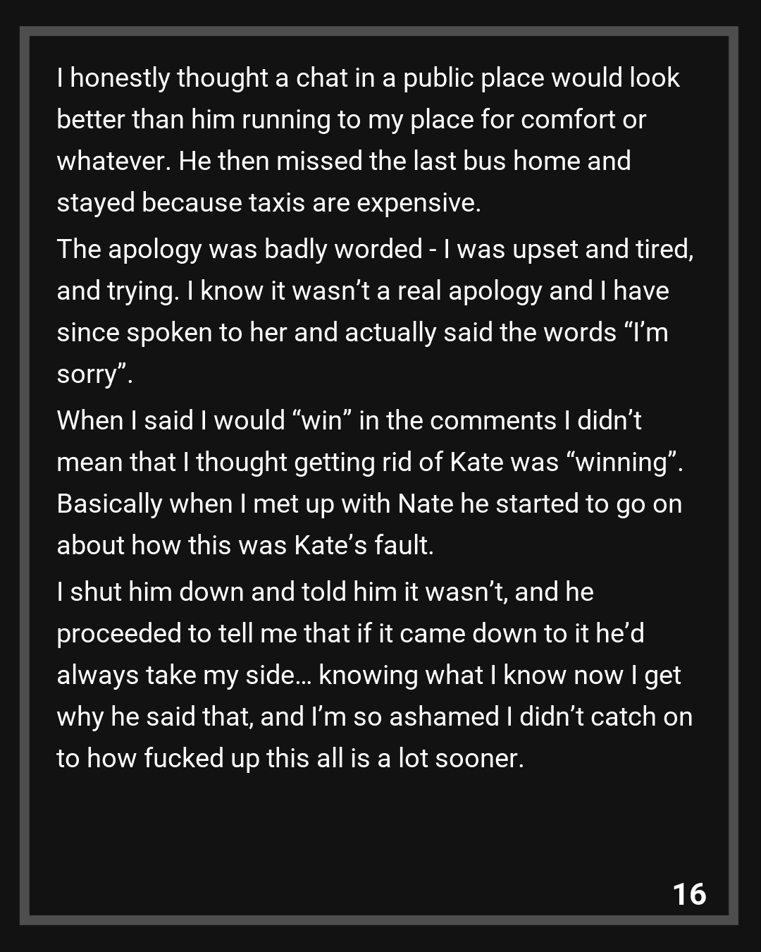 When I said I would “win” in the comments I didn’t mean that I thought getting rid of Kate was “winning”. Basically when I met up with Nate he started to go on about how this was Kate’s fault. I shut him down and told him it wasn’t, and he proceeded to tell me that if it came down to it he’d always take my side… knowing what I know now I get why he said that, and I’m so ashamed I didn’t catch on to how fucked up this all is a lot sooner.