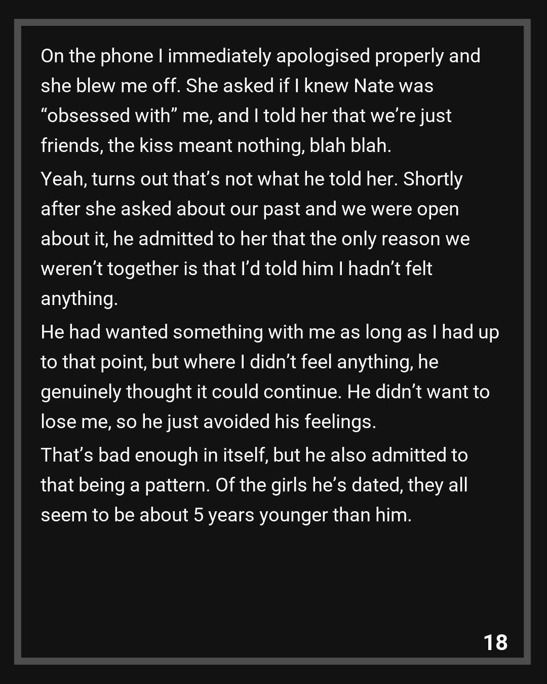 On the phone I immediately apologised properly and she blew me off. She asked if I knew Nate was “obsessed with” me, and I told her that we’re just friends, the kiss meant nothing, blah blah.