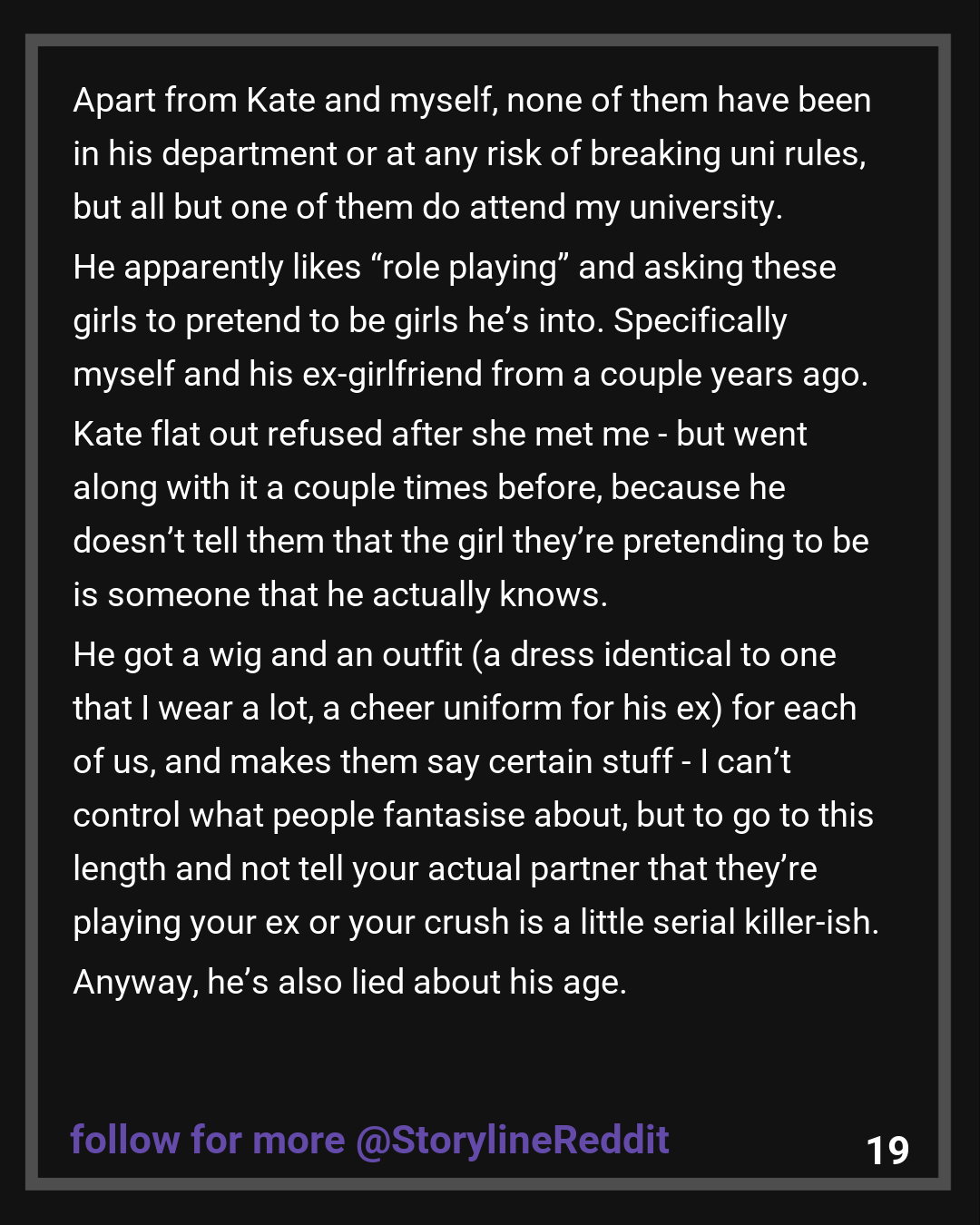 That’s bad enough in itself, but he also admitted to that being a pattern. Of the girls he’s dated, they all seem to be about 5 years younger than him. Apart from Kate and myself, none of them have been in his department or at any risk of breaking uni rules, but all but one of them do attend my university. He apparently likes “role playing” and asking these girls to pretend to be girls he’s into. Specifically myself and his ex-girlfriend from a couple years ago. Kate flat out refused after she met me – but went along with it a couple times before, because he doesn’t tell them that the girl they’re pretending to be is someone that he actually knows. He got a wig and an outfit (a dress identical to one that I wear a lot, a cheer uniform for his ex) for each of us, and makes them say certain stuff – I can’t control what people fantasise about, but to go to this length and not tell your actual partner that they’re playing your ex or your crush is a little serial killer-ish.