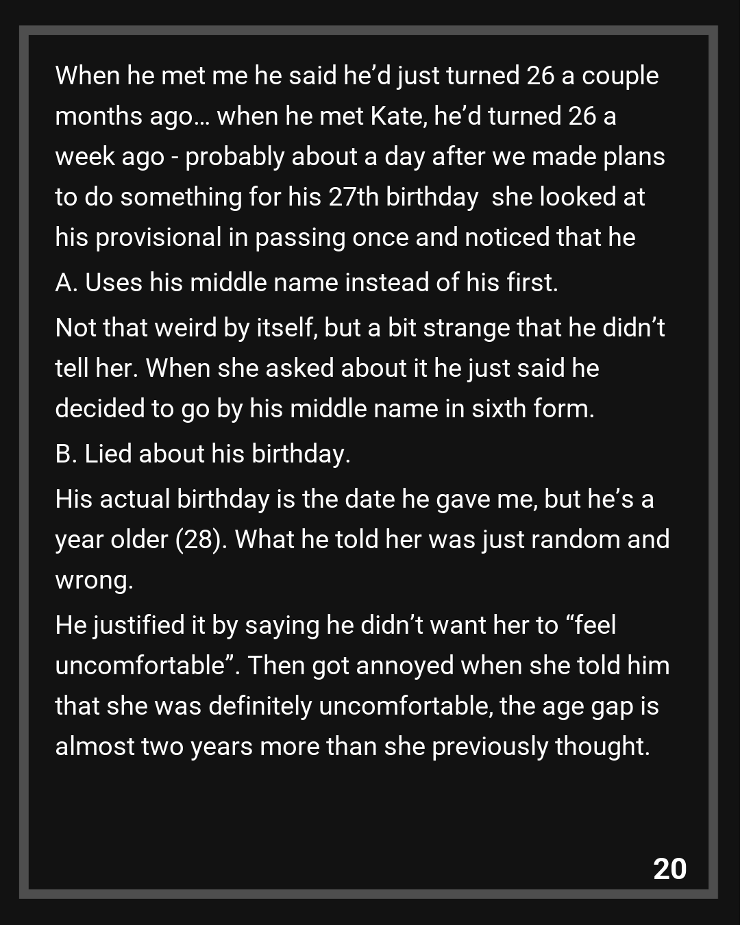 B. Lied about his birthday. His actual birthday is the date he gave me, but he’s a year older (28). What he told her was just random and wrong. He justified it by saying he didn’t want her to “feel uncomfortable”. Then got annoyed when she told him that she was definitely uncomfortable, the age gap is almost two years more than she previously thought.